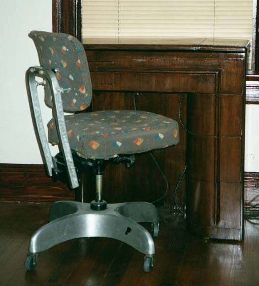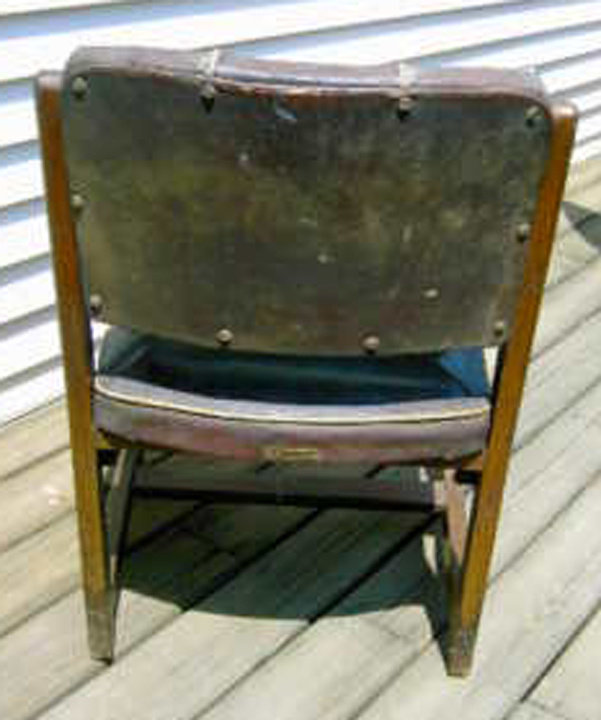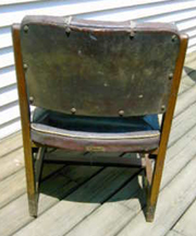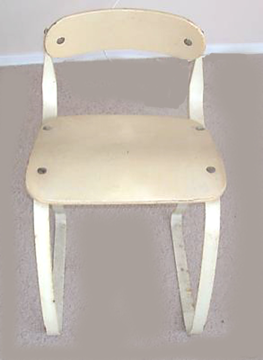 The IronRite Health Chair, Before and After An Absolutely lucky find... About a month after I found the IronRite machine, I was at an estate sale in Bethesda. Off in the corner was a beat-up molded plywood chair. Upon examination, I was STUNNED to find that this was an IronRite Health Chair, the official chair that goes with my machine. Not only that, it is the appropriate chair for the Model 85! (The later model [95] featured a chair with a reinforcing splat between the legs...) As you can see, a considerable amount of work was required to get this back in shape. Lord knows what the odds against repeating this feat are.. Well, good things come to those who search. The Health Chair should have the authentic Ironrite Decal on the back. Here is a closeup of what it looks like. Unfortunately, the decal is placed right in the center of the back, right where you would hold the chair; in many cases the decal is worn away ![]() The Official decal from the Ironrite Health Chair Like everything else about the Ironrite, the Health Chair was invented by Mr. Herman Sperlich, founder, CEO and chief cook & bottle washer for the Ironrite Company. Here is his design patent for the chair, issued in December of 1938, and for reasons discussed below, it is shown next to the patent for a "spring steel chair" developed by Famous Artist Marcel Breuer