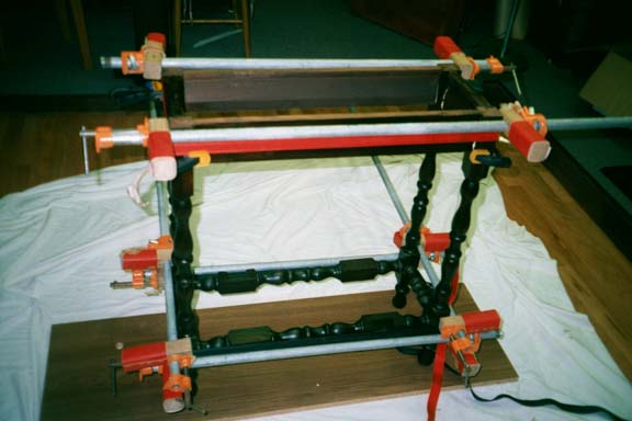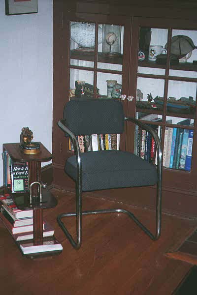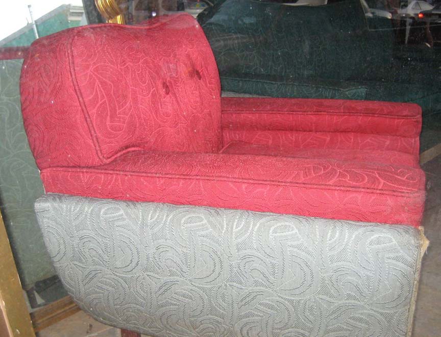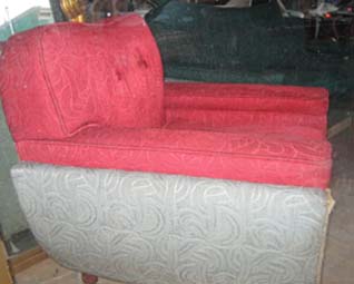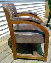 This set of photos illustrates the things that you can do with stuff that other people throw away. Sunday September 20, 1998 My partner and I attended a rummage sale at a church in Chevy Chase. I found a tubular steel Art Deco chair sitting off in the corner --- it had a $1.00 price tag on it, but it was in unusually bad condition. Someone had re-upholstered it in very bad "nausea Green" Naugahyde. (NO Nauga should perish for this horrible color...) On the other hand, the chrome steel tubes of the chair form the outline of a perfect cube. I peered beneath the dust cover and noticed an oak frame with springs that had been attached by hand sewing. This detail and the aesthetics placed the piece in the late 1920s, early 1930s, so I took the fateful step and got out a dollar. One of our readers suggested that it may have been the work of designer Gilbert Rohde. It certainly has a lot of style. On Monday, I found myself knee deep in problems with the Art Deco chair. It seems that someone had left the chair out in the rain a lot! On the positive side, the padding was real horsehair and cotton batting. On the negative side, only forensic pathologists can appreciate dealing with rotting horsehair and cotton batting. When I got the ugly naugahyde cover off and disposed of the padding, I found that the burlap had degenerated and there was considerable rot in the frame --- particularly in the sculptured back which seemed to be made out of a zillion pieces of laminated wood. So, I put away my upholsterer's tools and took up my carpenters tools. Alas, most of the rot was concentrated in the edges of the frame --- the same places that need to be very sound to accept the tacks and staples that hold the padding and fabric. It was fortunate that our pile of scraps from old furniture repair had enough wood to reconstruct the frame. The downside was that this took a whole bunch of time... On Tuesday, working with a newly reconstructed frame, I had to re-set the springs, a process that is singularly difficult and about as exciting as watching paint dry. Not only is it physically arduous and boring but there is hardly any room for error. The springs have to be tied six ways and then burlap must be stiched over them. So far, I had invested only about eight hours of work in my dollar chair... On Wednesday, We trip to the Fabric Store. We spent about an hour peering through the remnants bin. At the bottom of the pile, we found the perfect fabric --- it looked great and it had a regular small pattern that would be easy to match. Fabric and thread came to $25. Next, we went to an Upholstery shop. I had decided to replace the horsehair with three inch high density non-degradable foam; prices for this stuff are sky high --- enough foam and dacron batting for the job came to about $30. The cushion requires welting between the seams, so that means sewing through four layers of cloth. My sewing machine would not handle the thickness, so we had to sew all the cushions by hand, something that kept us busy for another four hours. Pulling, tacking and stapling consumed another two hours. By the time that we proudly placed the chair in the living room, we had invested about fourteen hours and about $60 in our dollar chair. Some things only look like bargains.