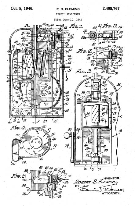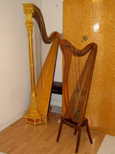 ![]() Globe and Pencil Sharpener Click to enlarge any photo Click here if you want to learn how to get Free Patent Drawings Above Paul's desk is a streamlined clock to match the turquoise desk accessories. ( a Telechron "Advisor", model 2H27, introduced in 1949.) To the left of the desk are Paul's Harps. The Clark Irish Harp is locked into its folding taborette. Beside it is a mid 1870s Erard Gothic Harp (French factory). The Clark was made from 1915 to the late 1940s and was virtually the only harp of its size sold in the United States at the time. It was made by the Melville Clark company until the 1920s, when the Lyon and Healy Company took on the Clark Company's manufacturing. In the late 1930s, Lyon and Healy had too much demand for pedal harps and shifted manufacturing back to Clark. Lyon and Healy lever harps are available with the same soundboard decal to this day. The Clark has a lighter tension and thinner soundboard compared to almost all harps of its size made today. It's very resonant, and its timbre is comparable to an early 20th century pedal harp. Paul says, "It's a joy to play, but it's fragile, which makes it a bit scary to tune. Even a small harp like the Clark has 1,000 lbs of string tension pulling on its soundboard and neck. In the 19th century, pedal harps like the Erard Gothic were as common in people's homes as pianos are today. The Clark would be the most likely newly purchased harp to find its way into the average American home of the 1930s-1940s due to its size and price..."