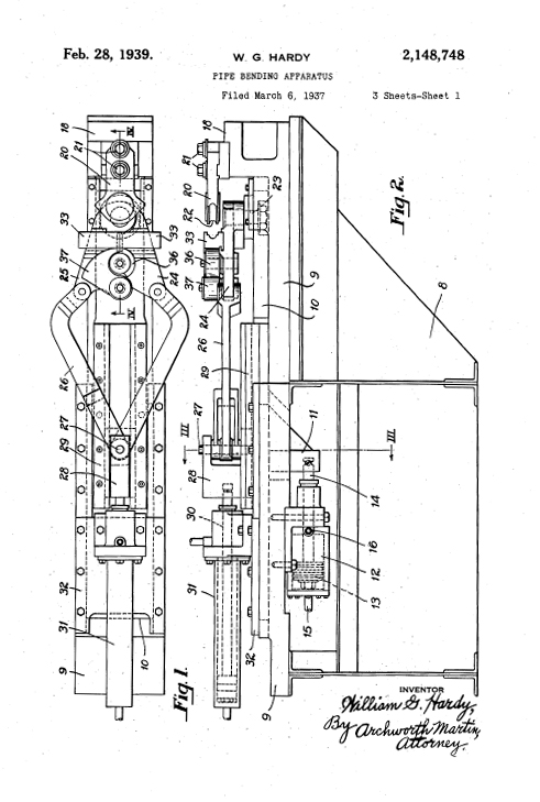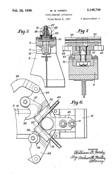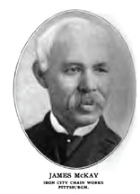 ![]() James McKay, Oil Man, Miner, and Metal Bender W.G. Hardy for the McKay Company, Pipe Bending Device, Patent No. 2,148,748 Click on Either Photo to Enlarge It Click here if you want to learn how to get Free Patent Drawings James McKay was born in Ireland in 1830 and emigrated to the United States in 1848. He began as a wholesale grocer, but became became identified with the oil industry during the boom of 1876 in Butler county. He owned "Jenkins Oil Field" that produced about three thousand barrels per day. Looking westward, he purchased the "Yankee Girl Silver Mine". This was one of the largest mines in Colorado. In 1887, he organized firm of James McKay & Company, taking into partnership his two sons, Robert J. and J. Albert. Among the enterprises conducted by the McKays was the Iron City Chain Company that fabricated a wide variety of products made by bending metal.