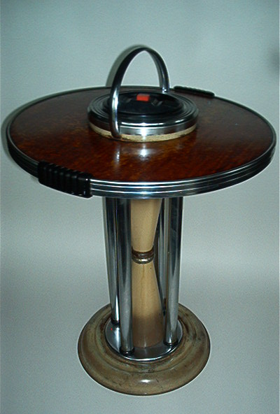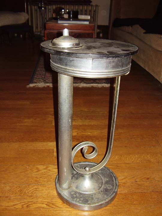 Assembly is made a whole lot easier if you have nut drivers. All bolts and nuts are standard sizes. You can buy a nichrome wire coil at an appliance repair store. The ceramic element and glass enclosure are unique to the piece. I got the right insulated wire by cutting the cord off an old waffle iron. PLEASE! Don't restore one of these if you have children in the house! Here is a smoking stand with definite Art Deco Lines. It has no markings, but it certainly sets the mood of the Swing Era. ![]() Art Deco Smoking Stand Click to enlarge.. Here are two more smoking stands that were cultural icons during the 1930s through the 1950s. Basically, they started out as art objects and eventually wound up in seedy waiting rooms and lobbies. Those of you who got on the bus in the 1960s will probably think that they are the ugliest things to be placed on Earth. I invite you to take another look at these objects in the context of their original design patents. First off, we have a beautiful object designed by Karl Kipp, who was very famous as the head of Metalwork for the Roycroft commune before World War I. By 1938, he was working for the Daystream Company, for whom he designed the following: