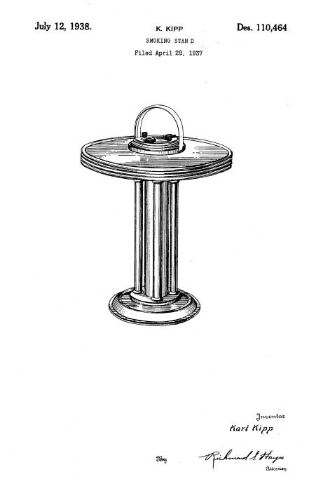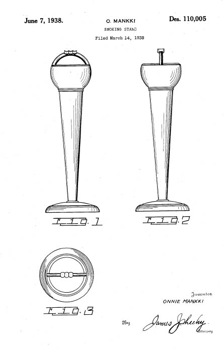 ![]() The Karl Kipp Smoking Stand -- Design Patent D-110,464 Click to enlarge.. The next smoking stand is almost invisible because it was found everywhere -- particularly in crowded waiting rooms and seedy hotel lobbies. It was designed by Onni Mankki, a Finnish designer/architect who settled in Cleveland Ohio.