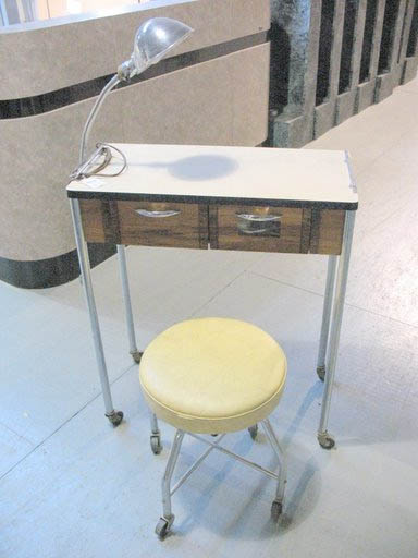 ![]() Modecraft Stylist Center Click to enlarge.. Here is another ModeCraft manicurist table, complete with the revolving stool and chrome "gooseneck" lamp. My guess is that this is a bit later than the one I own. ![]()  '