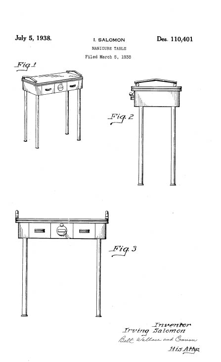 ![]() Patent Diagrams for Modecraft Designs by Hyman and Nellie Fidel (l)H. Fidel No 3,087,757 (mid) N. Fidel No. 2,919,746 (r.) H. Fidel No. 2,833,338 Click to enlarge. Click here to learn how to get your own FREE Patent Diagrams Returning to my manicurist table: On the top of the table, some of the other treasures are displayed, including (clockwise): 1: The FDR campaign lamp discussed below; 2: an unusal statuette of a monkey holding a basketball, possibly a commentary on student athletes of the 1930s; 3: a "See, Hear, Speak No Evil" statuette in jadeite; 4: the paint sprayer attachement for the Electrolux; and 5: the Brannock Device, a tool for measuring foot sizes in a time when people wore shoes besides sneakers. The Electrolux Model XXX sleeps under the table like a faithful dog... Click here to look at another type of collectible, or keep on scrolling for more Furniture. | |||||||