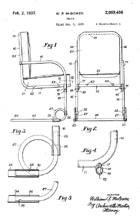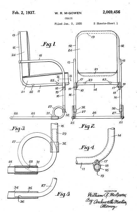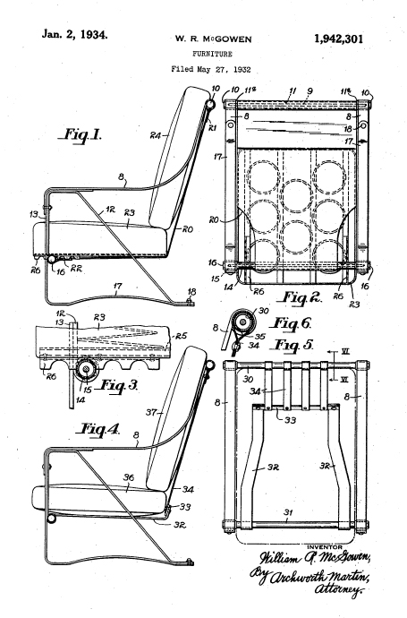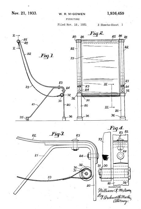William R. Mcgowen, Furniture Designer W.R. Mcgowen for the McKay Company, Patent 1,936,459, 1,942,301,2,069,456 Click to Enlarge It Click here if you want to learn how to get Free Patent Drawings As discussed above, Marcel Breuer was among the first to create furniture from bent tubular metal in the 1930s. As the fashion for this type of furniture advanced in the 1930s, William R. Mcgowen joined the McKays as a designer and produced a number of tubular and spring-metal chairs, stools, divans, etc. Some of his patents antedate those of Breuer. The firm continued to manufacture small quantities of commercial furniture (such as the shoe store stool) and was eventually sold in the 1960s to Teledyne Corporation. Click here to look at another type of collectible, or keep on scrolling for more Furniture. | |||||||