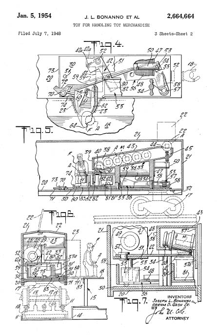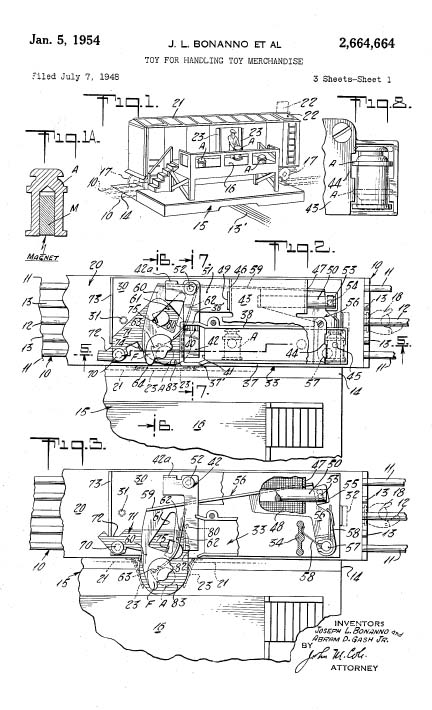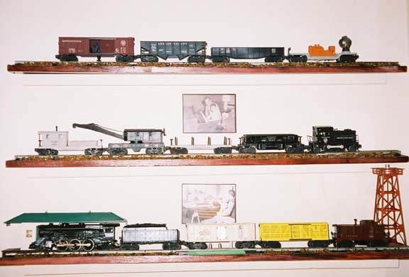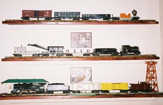 Here are some other items from my office. The first is a "Lawyer's Rotating Bookcase", so named because at one time, it would hold the entire federal Code of Jurisprudence. Needless to say, it is fairly old... The Lionel Train set was my actual toy in 1947; the pictures show me and my Dad playing with these very same trains You might be interested to learn that the unusal system of tracks used by Lionel Trains was invented by Mr. Joseph L. Bonanno of Maplewood, New Jersey in 1939. His patent was granted on February 10, 1942. Mr. Bonnano also invented the famous Operating Milk Car that entertained legions of children. (You can watch a video of this fascinating toy on YouTube. Mr. Bonnano received Patent No. 2,664,664 for his pioneering work. Keep that in mind the next time you need a sparkling tidbit to enliven an otherwise dull conversation. You might want to look at our Streamlined Locomotives Page to see more of our model trains.
