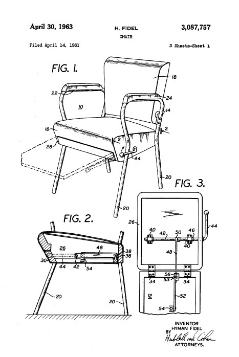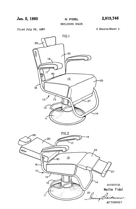 Modecraft Salon Chair (and Hair Dryer) Click to enlarge.. Here are some patents by Hyman and Nellie Fidel, designers for the Modecraft Company. The items include a folding chair, a barber chair and a movable footrest.  '