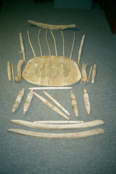 The Windsor Rocker, Carpentry Phase (left) As Found (middle) Repairing the Seat (right) Parts Repaired, ready for Finish