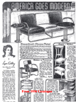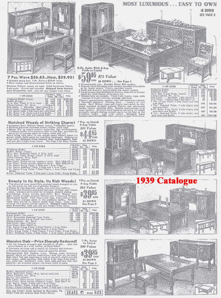 Honest to Gosh Art Deco Furniture in the Large Dollar Range (left)A Bleached Mahogany Coiffeuse (France, ca. 1925) worth about $12,500 (middle) A Coiffeuse with Chair en Suite by F. G. Saddier (France ca. 1930) Made of Loupe d' Amboyne (a rare wood), fittings of nickeled metal, the chair upholstered in fine suede, worth about $13,500 (right) Pair of Chrome Tube Chairs by Gilbert Rohde, (American, ca 1930) worth about $8,000 each Click to Enlarge Note: we call the "Coiffeuse" a "Vanity", the French term is more accurate, meaning a place where a lady might use a large mirror to style her hair. Using more mundane materials, this style of furniture was mass-produced from the 1920s through the 1940s. Some is absolutely terrible, and a small amount is breathtaking. The style is most frequently seen in Bedroom Suites, although dining sets and even billiard tables were produced. Here is a progression of styles offered in the Sears and Roebuck Catalogues from 1930 to 1939. Things that look like Art Deco are classed as "modern". Note that it is only in 1939 that sears calculated that there would be a mass market for "modern" furniture outside the bedroom.