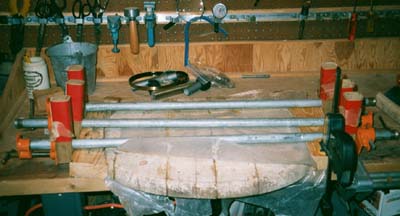 The lamp is very unusual. Made of pot metal, it depicts Franklin Roosevelt in storm gear steering the ship of state through troubled times. The inscription says "FDR Man of the Hour". Although the public knew that FDR was permanently confined to a wheelchair, they seemed to be perfectly willing to accept him in this heroic posture. We did a fairly close analysis and concluded that the piece had been brass plated. We did it one better -- we got a book of faux gold leaf and applied it to the lamp. We mixed up a batch of "sizing" --- full-strength varnish with red pigment. This was applied to the piece and allowed to tack up for an hour. The leaves (microscopically thin) are removed from a booklet with a camel brush. You rub the brush on a piece of wool to generate static electricity and you can grab the sheet out of the book. This is applied to the piece and patted down gently with a 1/2 inch artist's brush. The result is very striking. The red pigment on the sizing gives the gold leaf a nice rich color. Click here to look at another type of collectible, or keep on scrolling for more Furniture. | |||||||