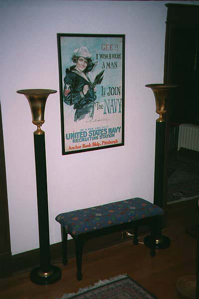 I bought this spectacular pair of Art Deco Torchieres from a funeral home in Pittsburgh. They used to be set at each foot of the coffin. They initially had Magnum sockets which meant that they used enormous high heat bulbs. After rewiring them, I had them in my office for years --- although they were borrowed on several occasions for use in the National Symphony Decorator Showcase Houses. Well, I'm not the only one with unusual taste... The recruiting poster ("Gee! I wish I were a man..") by Howard Chandler Christy is an original. My mother's father took it down on the day World War I ended. He kept it and left it for me. I have always admired the young lady's use of the subjunctive. That's a Steinway piano bench that someone threw away. I recovered it on Bulk Trash day. I refinished the base, but the top was too far gone. So, I upholstered it with a wonderful Deco print fabric that was on sale at G Street Remnants Click here to look at another type of collectible, or keep on scrolling for more Furniture. | |||||||