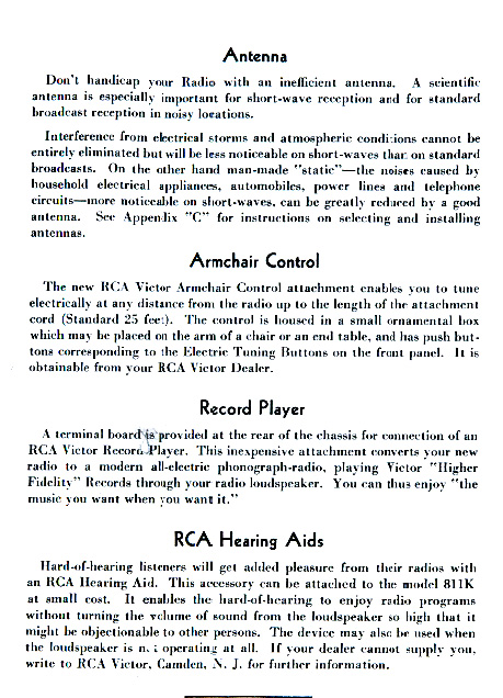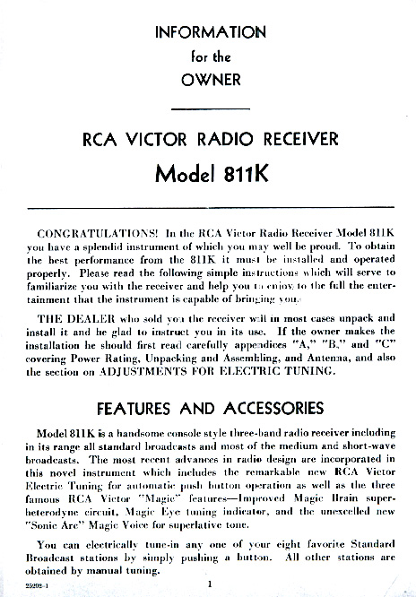 The RCA 811K (left) The RCA 811K Dial and Pushbuttons -- The "Magic Eye is at the Top Center (right) Another Collector's 811K Click to Enlarge Here is a video of the RCA 811K in action. An 811-K appears in the film Above and Beyond, the story of Paul Tibbets, the pilot who dropped the atomic bomb on Hiroshima. Mrs. Tibbets gets the news of her husband's achievement on a well-scuffed 811-K. This is not surprising since the film was made in 1952 and the radio was probably sitting in a prop room for 15 years. Our socks were knocked off when we got this letter from our reader A.B: "... I do believe that I was the previous owner of the 811k in your video. I sold it about 18 years ago at a ham fest to a young couple who I believe that sold it to you. The scratches on the front of the curve are from my cat Kojak as he jumped and missed one day. To be sure that this is the same machine on the right side as you face the radio is a gouge into the finish about 2 inches long and about 1/2 inch wide that happened when I moved and something fell against it. If this is the case, I am glad to see it is still alive. B.T.W there is a KEY that goes into the tuning device on the back that slides through the two holes and is square to fit the notch in the wheel. You put the key in a hole and then turn the dial until the key drops then you tune your station and remove the key. Each slotted disk corresponds to a button on the front of the radio ..." Not only that, "A.B." also scanned the owner's manual for the 811K which is very interesting in itself. I DID NOT know that there was an "armchair control" that could be attached to the thing. Below are the cover of the manual and the List of Accessories. We also are pleased to present the complete 811K Service Manual.