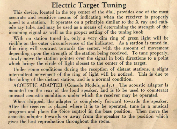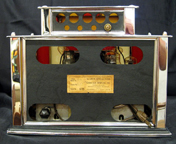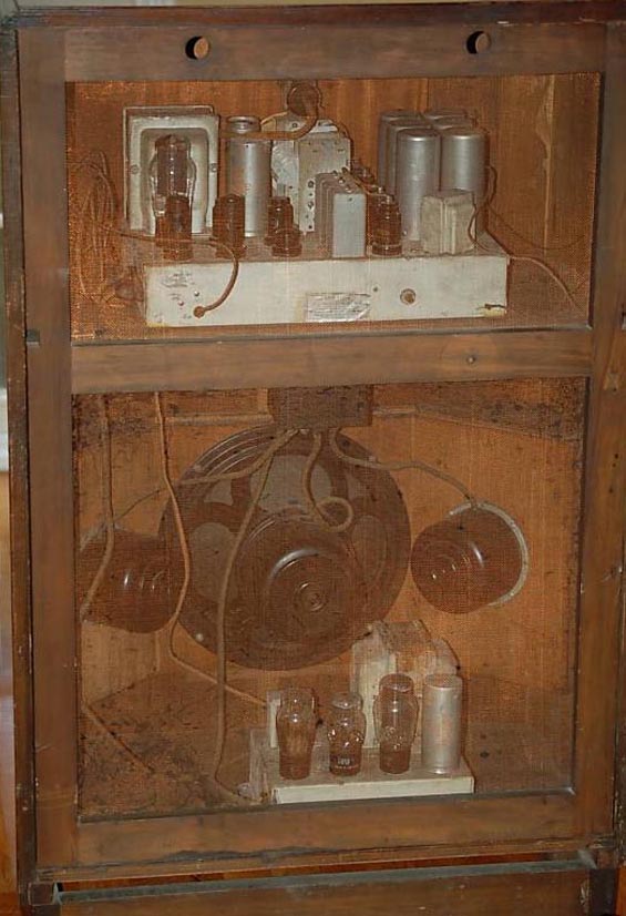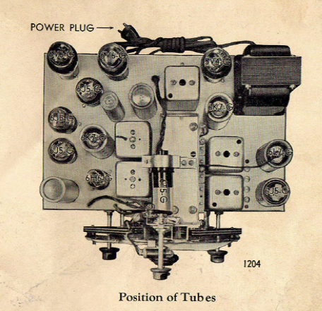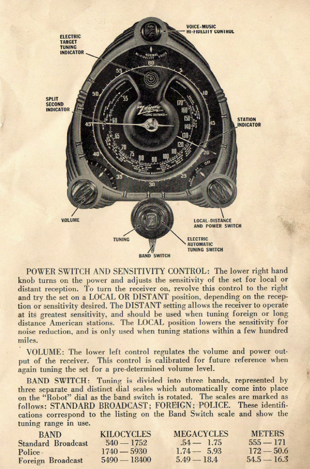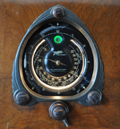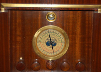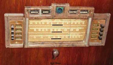 Dial, Chassis and Waterfall Details Click to Enlarge The set features the famous "Robot Dial" (see above) and "split second tuning" which used two indicators ("needles" or "hands") to perform the chores of gross and fine tuning. In addition to this, the set came with a Magic Eye indicator to assist in tuning. (Short wave broadcasts from abroad were popular, but very hard to tune). There is also an automatic volume control that allows you to receive high frequency sounds ("High Fidelity") or to squelch them out ("End Static"). This set even anticipates hip-hop by allowing you to boost the Bass frequencies! (Probably very popular with the "killer-diller" youth set.)