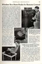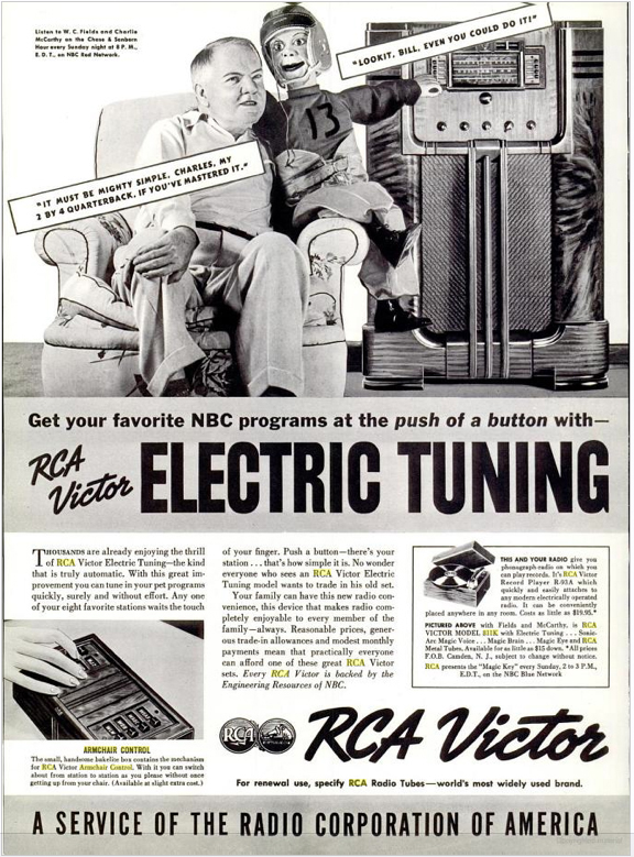 Some judicious searching revealed an ad in the August, 1938 issue of Popular Mechanics that featured not only the 811K remote but also W.C. Fields and Charlie McCarthy. The RCA 811K Remote Control From the August, 1938 issue of Popular Mechanics Click to Enlarge Not only that, we had this lengthy note from our reader Jack: "... My grandparents bought one of these new, and as a kid, I inherited it. I had a phonograph hooked up to it and would play records, mostly 78s, through it. I had the armchair control box, which I hooked up and played with. The box used the same push button switches as the tuning buttons on the front, and used similar labels, though they were not back lit. There is a switch on the front of the radio to select remote control operation. Our radio was set up for Chicago stations, and the tuning worked pretty well. The armchair control box was brown bakelite, and was wired to the radio with a big flat cloth covered multi-conductor cable. I used to get the occasional shock from the cable, as the cloth over rubber insulation was breaking down, and I stood on a concrete basement floor. Aside from records, I was introduced to rock and roll radio on this radio, and listened to short wave broadcasts. The short wave bands produced a lot of interesting sound effects back then, as there were people transmitting images with a type of fax system that sounded like a propeller airplane if you tuned it in (see below). We used a long-wire antenna for short wave...." "As a teenager, I dismantled the armchair remote control, as the wire insulation was at this point crumbling to dust anyway. I used the switch assembly as a keyboard for a crude electronic music synthesizer I built. I saved the box and buttons, though...." "As a young adult, I moved the radio with me to my first apartment. It maintained an place of honor in my dining room, though by then it required replacement filter capacitors, something I never got to. I became a broadcast engineer in those days, and was working two jobs to pay for my half of a $100/month apartment. Several years later, I got married, and moved out of the apartment, but left the radio in storage in the basement of the building for a year. When I went back to retrieve it, the radio was gone. I never saw it again. I was a terrible loss, but I was stupid to think it would just stay in a relatively un-secured storage space...." "Within the past year I saw an armchair remote box at an antique show. I knew what it was, the seller didn't. I didn't buy it, because I don't have the radio of course, and have little hope of owning one again. ..." "On our last trip to California (we live in Chicago, drove over 7000 miles this time), I met the founder of iantique.com, an antique 'social network' site. I joined the site, and I really enjoy it. Very active, though the networking part is light, they put up lots of very informative videos. Anyway, this week I started a Antique Radio discussion group, and I'm posting pictures of some radios I've seen on the trip. There's a shot or two of a wonderful Crosley floor model there. You can join the site for free ... might be worth a look for your readers. The radio group is new, and needs some discussion! I also started a Microphone/Telephone group too..."