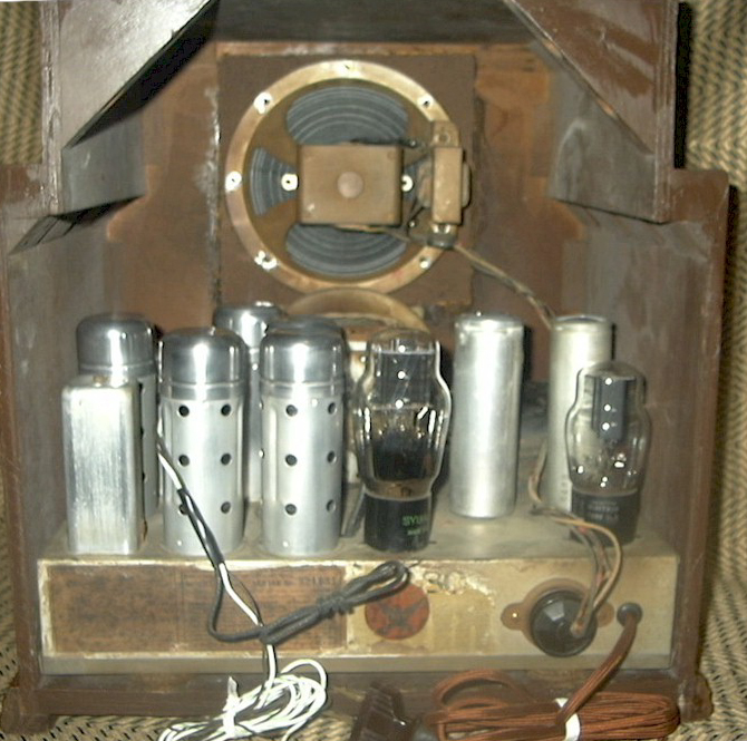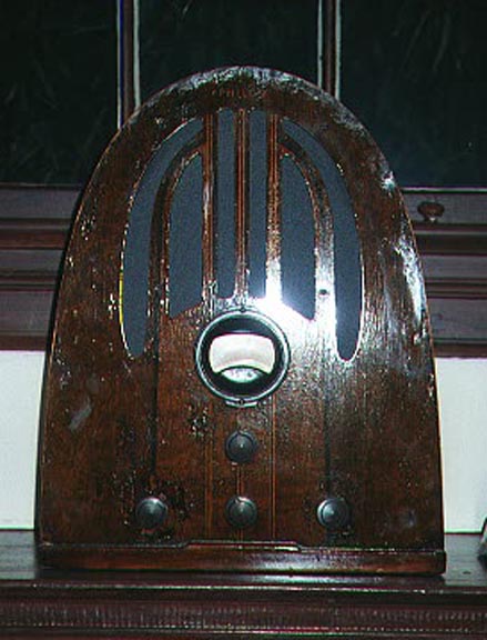 This is the classic Philco radio, symbolic of that which was in the homes of thousands and thousands of Americans during the 1930s. This particular model was made in 1937 and has the designation Model 37-60B. We can just imagine the soft golden glow of the dial in a darkened room as folks gathered around the set to listen to "The Green Hornet" or "Fibber McGee and Molly" or maybe to hear the results of the Lindbergh kidnapping trial or the Hindenburg disaster. Perhaps this radio actually broadcast Orson Welles' "War of the Worlds" program and its original owners got scared out of their wits. I got this radio in Charlottesville in about 1972. It spent a part of its life in the Billiards parlor out behind Eljo's and I picked it up for about a dollar in the auction when the place closed. That's another story... (actually, the Charlottesville Billiards parlor is memorialized in Installment 13 of The Serial) The problem with these Philco radios is that the elaborate burl inlay on the face is not really wood --- in fact, it is varnished paper. Over time, the paper deteriorates. In order to restore it, I had to use a very thin brush and draw in the missing detail. This was a VERY tedious process! And, you have no idea how difficult it was to find authentic parts for the radio. Here is some technical detail from the label: Code 121 115 VAC 50-60 Cycles 60 Watts 39-4759 Cabinet: part 10226A The Tube Lineup is: