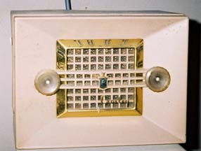Posted July 3, 2002 This is another artifact from Carl Kirtley's Treasure House. The model is quite unusual in that it is symmetric, giving the appearance that it has two speakers. In fact, there is only one, in the left bay. The right bay has a loop antenna. From what we can see, this appears to be a variant of model GE H-624. Both models share the same center design (and push button tuning). More about this will be posted soon Click here to look at another type of collectible, or keep on scrolling for more Radios. | |||||||