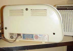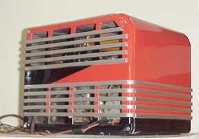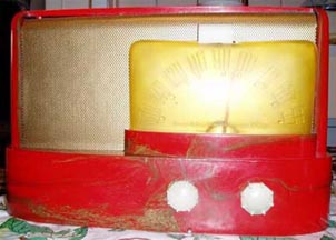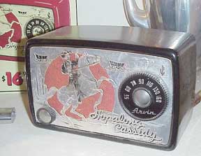 Posted November 22, 2002 Hopalong Cassidy Radio This was sent by the remarkable 40s Phil in Indiana. the Arvin model 441T featured the image of cowboy star, Hopalong Cassidy, on his horse Topper. The western motif was carried over to the metal back. When not in use, the wire antenna (the "Lariatenna") was intended to be hung from the pommel of a stylized saddle embossed on the back. This was a 4-tube set with a totally unbreakable metal cabinet, that was available in red or black. The red version seems to be commoner, but tends to command higher prices. The front is a piece of embossed and painted foil, and often shows finger wear around the knobs. Phil writes: "The metal sign indicates that the price was $16. I bought this at an extremely 'ratty' moving/storage company in the worst section of Cincinnati, Ohio about 10 years ago. At that time I wasn't particularly interested in it but I figured I couldn't go too far wrong for ....... $4.50. It needed some electrical work and I put a new paint job on it.." Note that these things now sell for $450 and up. Click Here to see another collector's 441T. And, Here is another. Check my page on Vintage Toys for more Hopalong Cassidy stuff. Click here to look at another type of collectible, or keep on scrolling for more Radios. | |||||||
