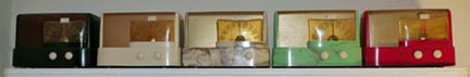Posted March 24, 2005 This radio, made in 1946, has a Bakelite Case, although Emerson also made a wood version of this design. This one is my favorite with the green-swirled Bakelite. The dial cover seems to float over the gold metallic grill, which covers much of the front. The dial cover is held on at the top top little cube of translucent ivory plastic (shown right above the dial indicator). A pilot light is hidden in this cube. When you turn on the radio, the illuminated block lights the dial. Here is a picture of a whole bunch of moderne radios that was sent in by our reader Mark: ![]() A Row of Emerson 511 Radios Click to Enlarge Mark writes: ..." I saw your picture of the Emersion 517 radio and though you could use a better picture of them. The shelf did not have room for [my whole collection] and the wooden version and the brown bakelite version are not shown. There are some radios for which the grill was painted blue instead of gold, although I believe that this was not done at the factory. The red with gold swirl and the green with gold swirl are the most sought after. The brown and black are made of bakelite and rest are made of Plaskon. The Plaskon version almost always have a 3/8" crack in the case at the front left bottom corner where the front grill meet the case. Those that do not bring very high price. The radios on the shelf are: black, white, white with gold swirl, green with gold swirl and red with gold swirl. This radio was designed by Raymond Loewy "... Here are links to pictures of OTHER Model 511 radios: