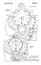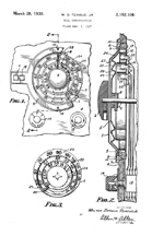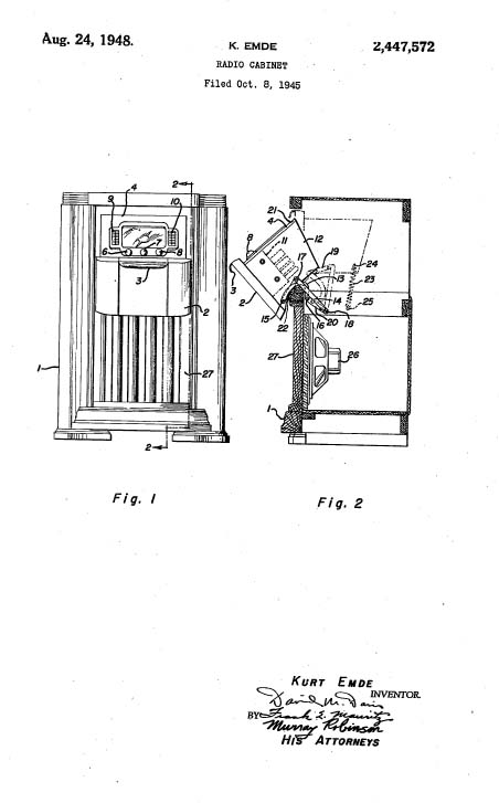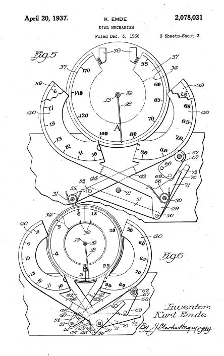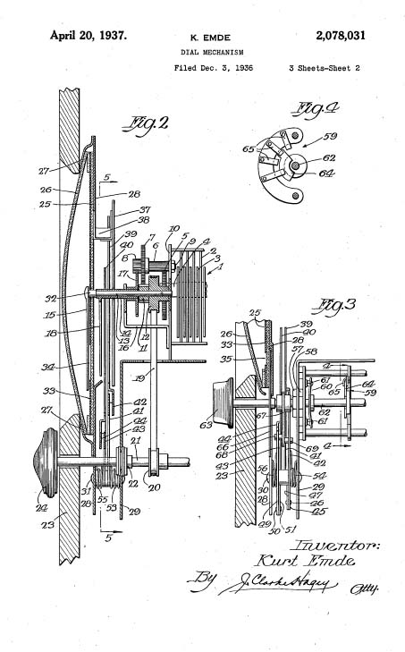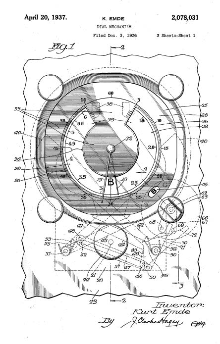 The Emde "Shutter Dial" Patent No. 2,078,031 Click to Enlarge Click here if you want to learn how to get Patent Drawings The expensive console receivers of the 1930s were the equivalent of today's Home Theater systems. They were designed as "all wave" radios to cover a braod spectrum of broadcast frequencies including the low frequency local broadcast bands and the high frequency "short wave" bands. The latter were used for international broadcasts because it is possible to attain much more distance by reflecting short waves off atmospheric layers. Many listeners took great pleasure in hearing broacasts from London, Rome, Berlin and Tokyo. A considerable amount of fine classical music was available, and political news from world capitals was much sought out given the relatively limited coverage of newspapers. Also, the short wave bands allowed folks to listen in on police, fire, and aircraft radio traffic as well as time and weather information. The "all-wave" band system was somewhat analogous to today's cable programming. Prior to Mr. Emde's invention, the various "bands" were shown as concentric circles on a dial. Mr. Emde noted that "...the wide range of frequencies covered particularly the short wave bands cannot be indicated except in a very general way and .. has little practical value.. and is confusing to the operator..." The shutter dial offers the user a number of interchangeable dial faces that give the proper detail necessary to tune whatever band was desired.