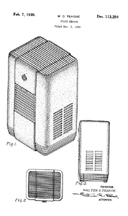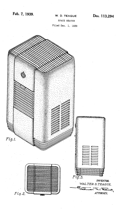 Walter Dorwin Teague Designs and the Sparton 1476 Patent for Radio Dial No. 2,152,106 , Patent for a Space Heater Cabinet, D-113,294 Click to Enlarge Click here if you want to learn how to get Patent Drawings Some sources reported that the Model 1476 radio was designed by Walter Dorwin Teague a famous contemporary of Raymond Loewy and Henry Dreyfuss. Teague attained a significant portion of his repute by designing cameras for Eastman-Kodak. We cannot find any definite proof that the entire radio was designed by Teague, although it is clear that Teague designed the radio's dial. The patent drawings above show a design for the cabinet of a space heater that bears a strong resemblance to the Model 1476, so it is possible that Teague designed the 1476. It is well known that Teague designed the 1936 line for Sparton, including the legendary "Nocturne" (Model 1186, above), the Model 557, the Model 558 and the Model 409GL.
