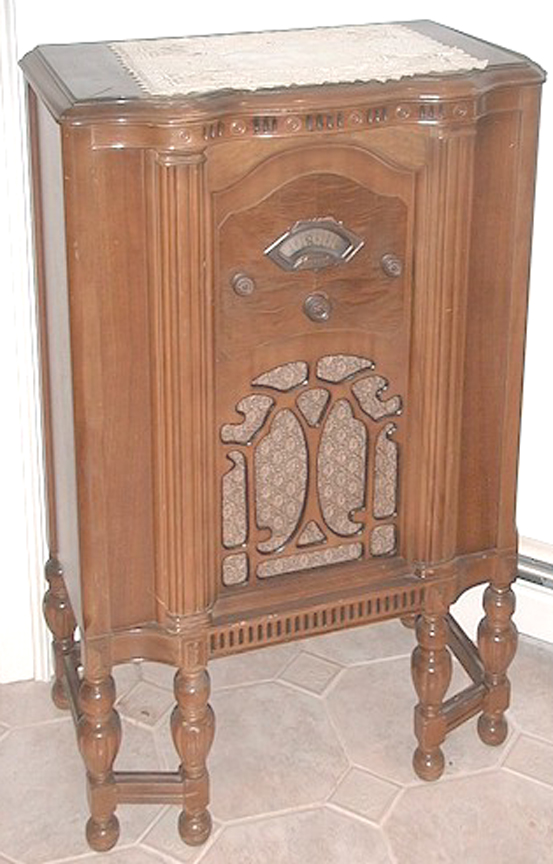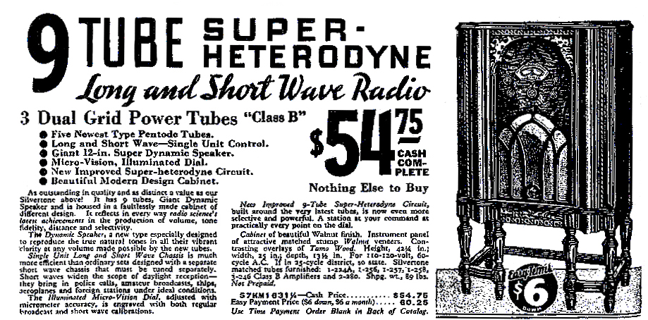 The M-1808 Table Radio $32.95 in 1934 is equivalent to $930 in 2009 dollars Click to Enlarge The front awas finished in "carefully matched Waalnut and Madrone Burl veneers.." Click here to look at another type of collectible. Sears Silvertone M-1831 Console Radio [ca 1935]The Model 1831 is a 9 tube console radio that was the middle of the line for 1935. It had one speaker when high end versions were experimenting with two speakers.