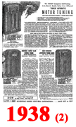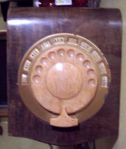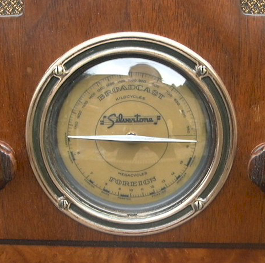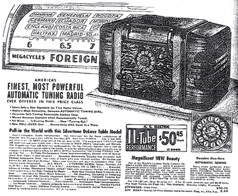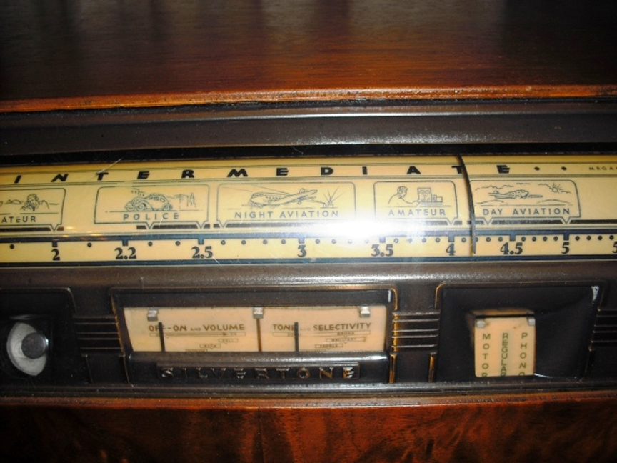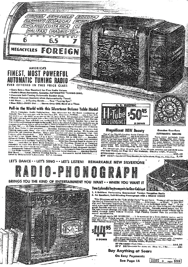 The Silvertone Model M-4766 Teledial Rable Radio $50.45 in 1938 would be equivalent to $1,560 in 2009 dollars Click to Enlarge The 11 tube radio was housed in a cabinet featuring "... Exquisitley grained stump and walnut veneers used in the one-piece front and top panel with bands of stripe walnut..." Click here to look at another type of collectible. The Sears Silvertone Model M4688 Console Radio [ca 1938]".. Just press the button lightly..radio tunes itself..." begins the ad for the top of the line Silvertone radio for 1938. In fact, automatic tuning with electronic frequency control was all the rage at the time. The pushbuttons had to be set by a factory-trained representative. Foreign stations were bunched together on the megacycle shortwave band and hard to tune. To this purpose, the m-4688 used a 70:1 gear ratio to move the indicator VERY slowly across the dial. As an additional aid to tuning, an illuminated display was placed on top of the receiver. As you can see in the photo below, graphics were effectively used to enhance the drama of listening to police calls, aircraft traffic and broadcasts from afar. Unsettled conditions in Europe gave much greater import to these international broadcasts. Sears used some sort of legerdemain to squeeze an extra "tube" out of their radio -- the M-4688 had 14 real tubes, but was advertised as having "15 Tube Performance."