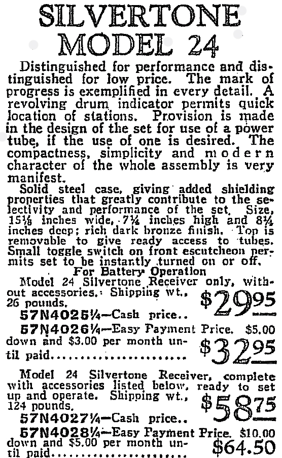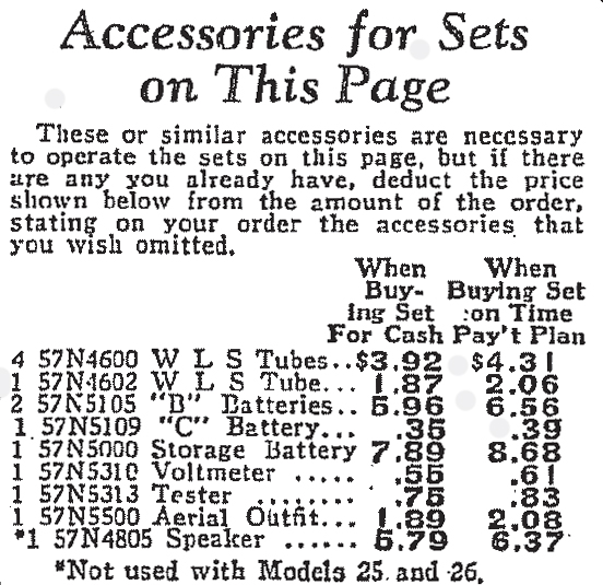 Big Print and Fine Print The big print price is without the tubes! Click to Enlarge The first observation is that the "Low,Low Price" for the radio does not include the tubes, something akin to selling a car without the motor. In fact, when all the "accessories" are added up, the price almost doubles from $29.95 to $58.95. Any of you who have bought a car based on the advertised price will not be surprised that the "add-ons" multiply like rabbits.