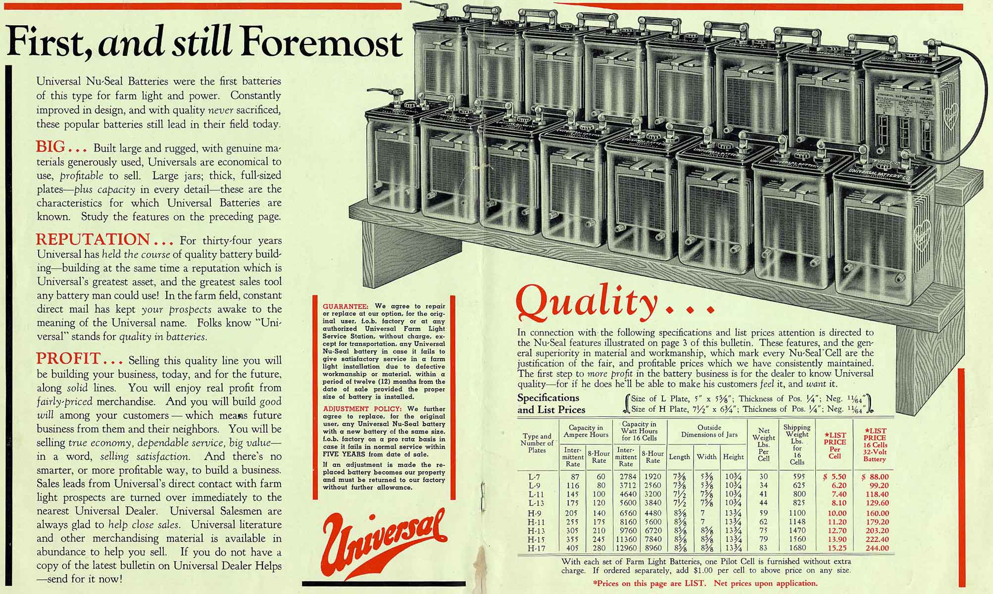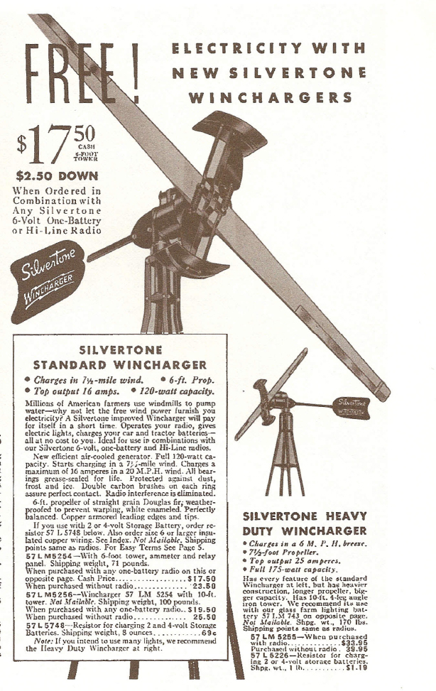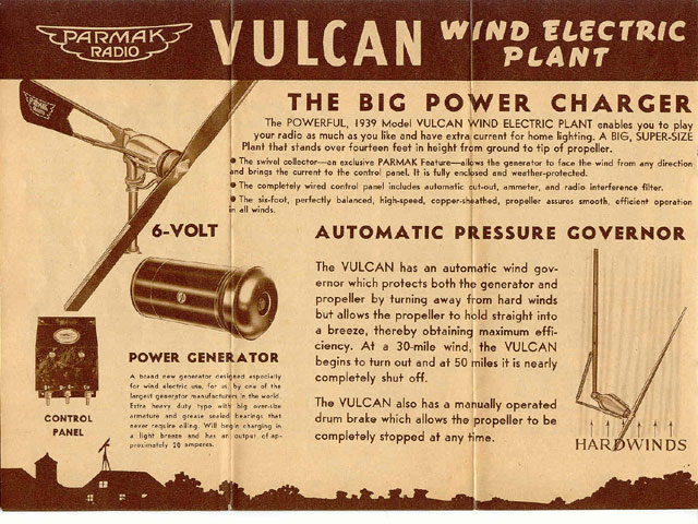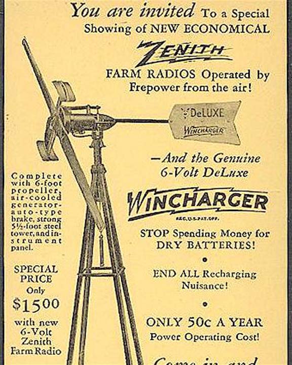 ![]() "Accessories" for Do-It-Yourself Wind Power The Universal Battery System The Wincharger Tower System Click to Enlarge You had to erect a fairly substantial tower and climb up there to tinker with the mechanism. If you ever harbored thoughts that the farmers of the 1920s were lazy rubes, forget it. The tower (and generator) came in a box, and the farmer had to erect it, keep it running -- including climbing back up the tower after a major storm to fix whatever damage had been done.. Was this a hobby of a few "trendy" farmers of the 1920s? Not at all -- there were a fair number of competitors in the market and all major manufacturers produced household and farming appliances that could be run on the DC current generated by the windmill. You'll note that both Wincharger and Vulcan went into partnership with radio companies. For a while, if you bought a Zenith console radio, you got the Wincharger (less tower...) for free. The Dunn system illustrates one of the major problems with wind generation -- something that still plagues even the most modern versions. If the wind has too much force (e.g a violent thunderstorm) the blades of the propellor or the bearings will be damaged. Every wind generator has some kind of governor change the angle of the blade so that they stop when the wind speed goes above a certain point. The Wincharger used sliding weights, and the Dunn system uses springs. Modern wind turbines have computer controls to "feather" (change the angle) of the turbine blades. All are really vulnerable to Tornadoes and Hurricanes So, why has America's mass involvement ith wind-powered distributed generation totally absent from the history books? The answer is simple, once the Rural Electrification Administration (REA) came to the farm with reliable AC current from the power company, the farmers GLADLY stopped climbing the tower and fiddling with the acid in the batteries. They switched on the lights, read their paper and let a milking machine take care of the cows without ever having to worry that the current would flicker out -- or that their expensive generator would get blown off the tower. Click here to look at another type of collectible. Sears Silvertone M-1535 Console Radio [ca 1931]This is an early console radio from the tim at which AC power was an expensive add-on due to both the size of transformers to convert AC to DC and the general lack of reliable electricity service in large parts of the country. Electricity was very expensive and many people found that it was cost-effective to use a battery. In the same ad, Sears sells a "One Year" battery for $7.95 (about $240 in 2009). The closest analogy for the 21st century would be prepaid cell phones or debit cards. These give people the ability to control total cost without worrying about monthly bills. Dad could buy one battery and if the kids used it frivolously playing the radio at all hours, then it would be too bad... but he wouldn't get socked with a surprise monthly bill.