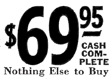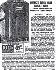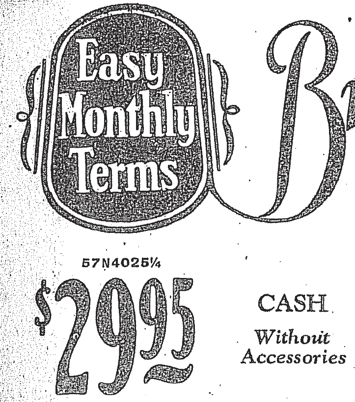 Our investigation of the price data has revealed some interesting facts. First of all, we'd like to comment on Installment Sales and deceptive advertising. You'll note that the Sears ads are full of talk about an "Easy Payment" plan ("$5 down, $5 a month") that are eerily reminiscent of today's Infomercials. You'll also note that the advertising copy touts each and every product as the greatest thing since sliced white bread. We'd like to alert you to the "Fine Print":