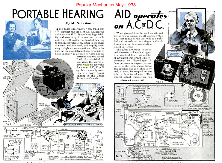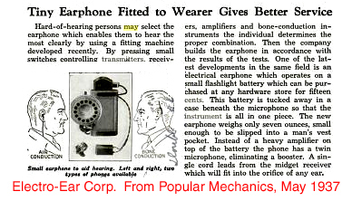 The Crosley Radio Printer (left)Do-it-yourself Kit Finch Patent for the Radio Printer No. 1,985,654 Click to Enlarge The printer came with two-layer paper, white on top, black underneath. The stylus cut away the white part to expose the black. This was wireless, so the rate of communication was only limited by the stylus at the end, not in transmission. It must have "buzzed" a lot while it was cutting the paper. Hearing AidsI have lost a whole lot of my natural hearing, so I must use technology to compensate for this loss. I have a drawer full of VERY EXPENSIVE hearing aids and I can assure you that they are simply annoying. A lot of my friends believe that hearing aids are like glasses -- that is, the minute you put them in, your hearing is magically fixed. That is not at all the case -- the minute you putthem in, the world sounds like it is coming from a very tinny old transistor radio. Since this is probably being read in 2050 or beyond, it will suffice to say that in the 1950s, small radios that used solid state amplification were popular. Because they operated on low power, they had small speakers and thus the sound was faint with almost no bass -- hence "tinny". In 2050, they will probably have developed a pill that will restore hearing, so this discussion may be really boring.My hearing aids are "reasonably small" meaning that if I move quickly enough and people look at my feet, they are hardly detectable. This was not the case in the 1930s. Do-It-Yourself Hearing Aid From the May, 1938 issue of Popular Mechanics Click to Enlarge Note that the thing was "portable" -- and that you could build it yourself. Here is an advertsiemnt for a commercial hearing aid that could be "custom-fitted" for the owner. "Custom-Fit" Hearing Aid The "Electro-Ear" Company... From the May, 1936 issue of Popular Mechanics Click to Enlarge Vintage Radio Ads![]() 1941 Advertisement for the Philco 1256 ![]() 1941 Advertisement for the Crosley line of radios