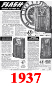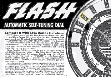 Silvertone M-4485 Console Radio (right) "Flash Tuning" was available only on high end models Neither the 4485 nor the 4486 had this feature $41.95 in 1937 is equivalent to $1,250 in 2009 dollars Click to Enlarge In 1937, high end Silvertone receivers used a "flash" dial. The tuning eye was gone, and stations were marhked on the dial. As shown above, when the indicator was placed over the station name, automatic frequency control would take over and the station call letters would light up. All of this involved tedious pre-setting by technicians; "Flash" tuning did not survive for long due to complications and cost. Click here to look at another type of collectible. Sears Silvertone M-4486 Table Radio [ca 1937]The M4486 is about the same as the 4485 except that it has 10 tubes and a 10 inch speaker.