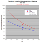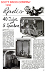 Tubes! Tubes! Tubes! Midwest Radio Ad, Popular Mechanics February, 1934 Scott Radio Ad, Popular Mechanics September, 1936 Click to Enlarge The largest radios offered by "Major" manufacturers had 18 tubes (e.g. the Zenith Stratosphere series) and were quite costly, some in the neighborhood of $600 in 1930s currency. The Scott Ad (left) promises a whole lot for 1934 including automatic tuning and a volume control that kept the sound level constant as you changed from station to station. If the illustration is accurate, the thing must have been 6-8 feet tall! If the performance came anywhere close to that touted in the ad, it was a bargain at $49.50 (about $1,500 in 2011 dollars) The forty tube wonder offered by the Scott Company (right) has to hold some kind of record for size and weight. The 40 tubes were spread around doing the amplification and frequency separation for those five speakers Since technology and features were changing rapidly, it is hard to see cost trends. The only place where some analysis is possible is in the area of battery powered farm radio consoles (see next section, below). Basically, it was almost impossible to get enough current out of batteries to support anything bigger than six tubes. So, the 6 tube circuit became standard for farm radios. As shown in the graph above, costs fell precipitously over the period 1929-1939 -- just like the prices on computers, flat screen TVs and cell phones did in the 21st century. So, there you have it -- Abusive lending, deceptive advertising, rapid obsolescence. Nothing has changed, has it? Sears Farm Radios [ca 1939]Nothing is new under the sun -- wind energy was powering radios on farms from the 1920s up until the 1950s