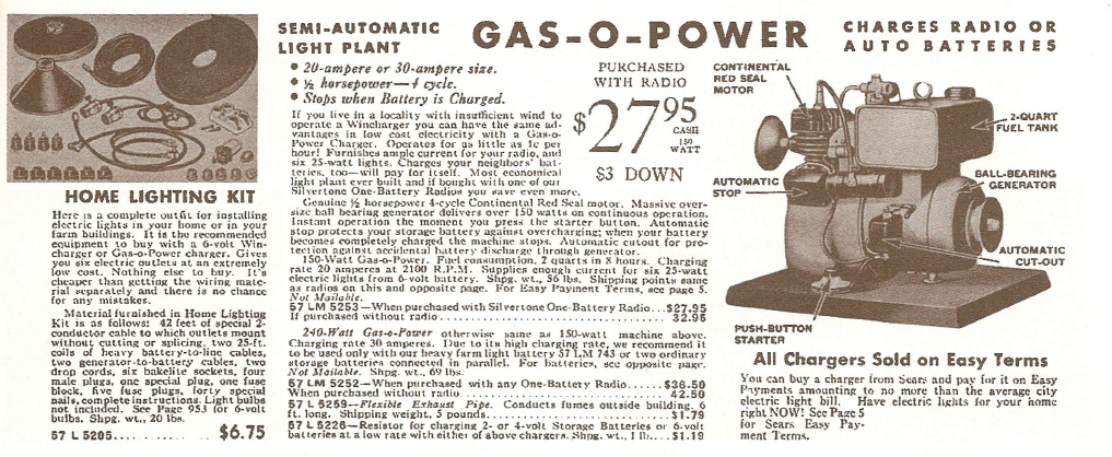 ![]() Combustion Alternatives to Wind Power (left) The Sears Power System (right) The Kohler 1A2 Power System Click to Enlarge The primary motivation for installing the Wincharger was simply to listen to the radio. In the 1920s, radio sets were pretty inefficient ant required a lot of current to keep those big tubes working. If you didn't have electic service, you needed a BIG Rack of 6 volt batteries -- just like the ones that were used in cars back then. (Since the 1960s, we have moved on to 12V automotive systems). Thus, having a radio meant that you had to keep the battery charged. Along the way, you had to pick up a few accessories....
