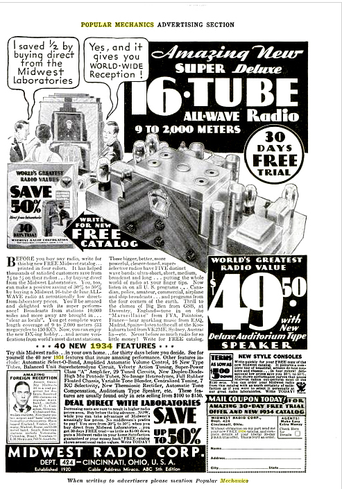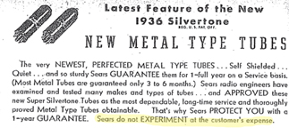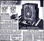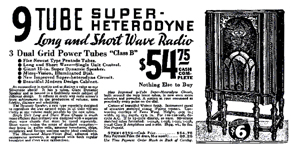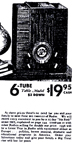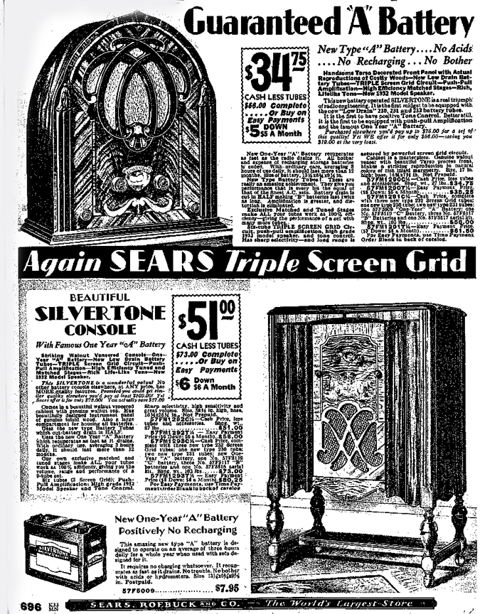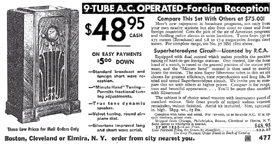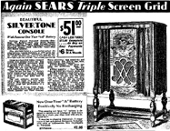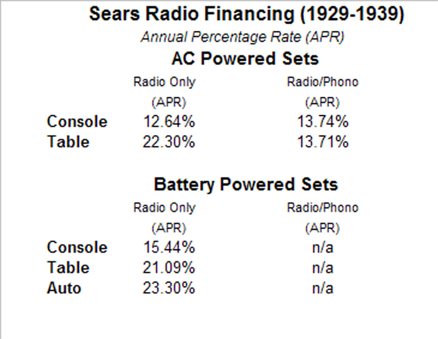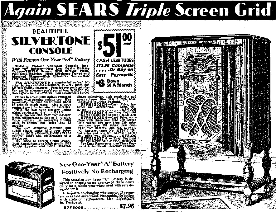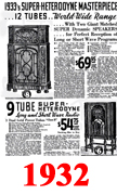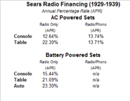 Analysis of the Deeper Meaning in Sears Marketing Click to Enlarge With the vast increase in Consumer Credit in the 21st Century, most folks have finally become conversant with the term "Annualized Percentage Rate" or APR. Federal Truth-in-Lending laws may have helped. There was none of this around in the 1930s. One might wonder about those "$5 Down and $5/Mo" schemes and what Truth in lending would have to say. We did just that. Until 1935, all the data required to compute APR were right there on the ad. After 1935, Sears determined that folks could do the math, so they made it a little bit harder, referring you to an obscure "easy credit" section in the back of the catalogue. They had good reason to hide the data! As the table above shows, they were lending money at APR ranging from 12% to 23% ! Buyers of console radios got the best deal at APR in the vicinity of 13% -- this when you consider the prime rate as at about 2%. Sears was not a liberal lender -- you had to pass a fairly stiff inspection if you were going to get goods on an installment plan. Table radios had APR of over 20%, so it seems that Sears made it easier to buy a big item on credit than a small one. Close analysis of APR indicates that Sears was willing to give much lower terms on obsolete items (in order to get rid of the stuff...) So, if your credit card statement gives you agita you can be somewhat comforted by the fact that your grandparents faced the same dilemma. Sears probably made more money off credit (lending for short terms at astronomical interest) than they did on their goods. It is hard to get comparable data, but some rough analysis of the information in the 1929-1939 catalogues indicates that the price of the radio was strongly correlated with the number of tubes. Each tube added about $7 to the retail cash price, something that would be equivalent to about $210 in 2009. This might be comapred to the cost of each gigabyte (or terabyte...) of storage in today's computers. To give you a little idea about competition based on "tubes" here are a few ads from the 1930s:
