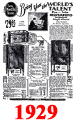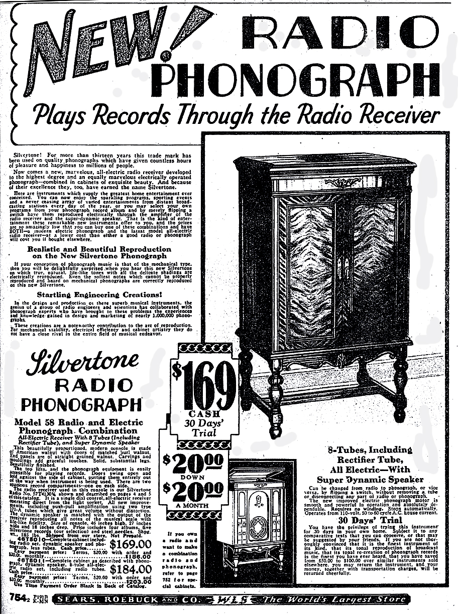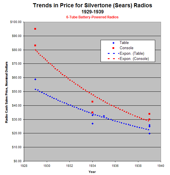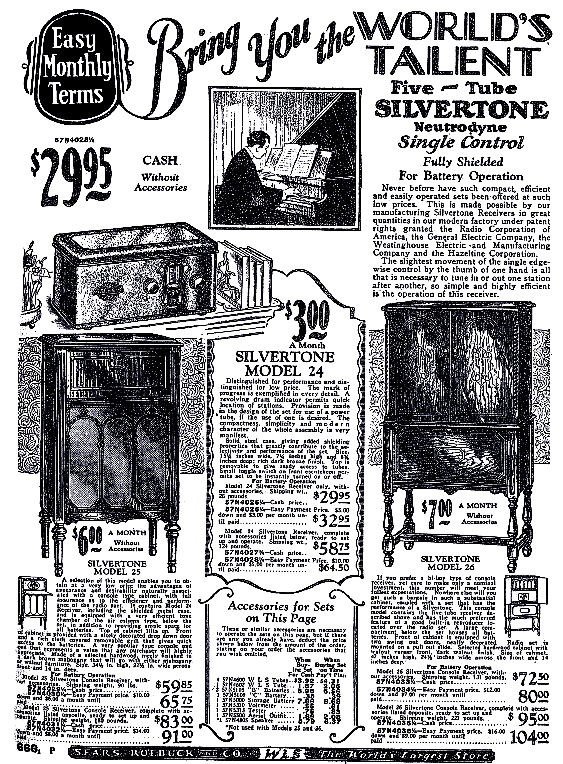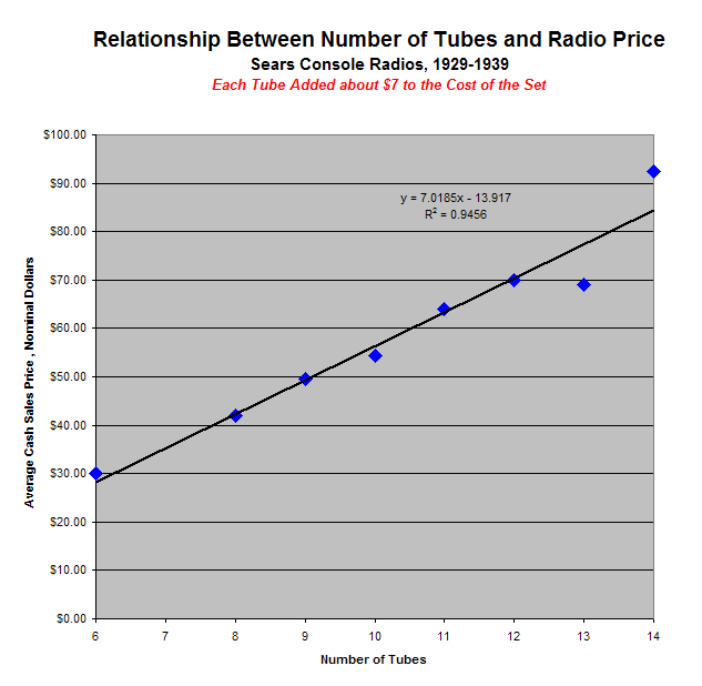 Sears Radio Ads from the 1929-1939 Catalogues Multiply the prices in the ads by about 30 to get the equivalent in 2009 dollars None of these were "cheap" - they are like a flat-screen TV in the 21st Century Click to Enlarge These advertisements cover a period in which Radio evolved at a frenetic pace, much faster than any technology before or since -- personal computers and cell phones required almost 20 years to penetrate the market to the degree that Radio did in 10 years. In 1929, radios are expensive, don't perform very well, and speakers are optional. By 1939. radios are offering connectivity to television "... when it does come ..." Radio development in the decade focused on four factors