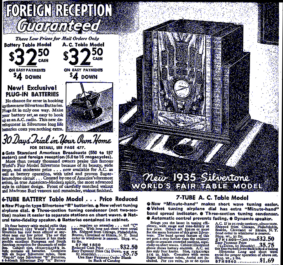 Silvertone M-1670 Console Radio Patent No. 1944554 for the Micro-Vision Dial Mechanism $54.75 in 1933 is equivalent to $1,650 in 2009 dollars This one came complete ... nothing else to buy Click to Enlarge Click here if you want to learn how to get Free Patent Drawings This is also the first year that radios were sold "complete" -- tubes and all. Click here to look at another type of collectible. Sears Silvertone M-1808 Table Radio [ca 1935]This is a slightly upgraded version of the 1934 "Worlds Fair" radio that "sort of" looked like a skyscraper. It was heralded as the "New 1935 Silvertone Worlds Fair Model." It was available in Battery and Ac power and featured a two-speed dial and automatic frequency control