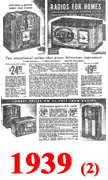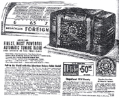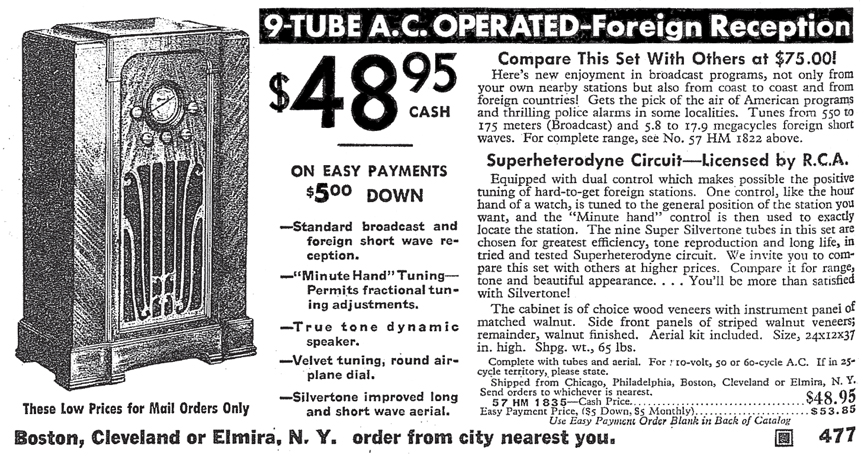 ![]() M-6337 (aka R-301) The price is about a month's wages for a working man in 1939 Click to Enlarge The ad takes pains to point out that "... when television comes, you will be ready for it ..." Since the actual bandwidth that TV would be transmitted on was subject to uncertainty, the ad also notes that the set "... has provision for plugging in an adapter..." This set had nine illuminated push buttons. Six were reserved for "favorite" stations, two are for tone control and one is a switch to the auxiliary jack (Marked "phono/television"). It should be noted that the pushbuttons could only be set by a trained serviceman. The tuner employed "super spread" bands for the foreign shortwave bands. Effectively, the 5.8 to 15.3 MC was split into four parts. This was advantageous because many international stations were grouped together -- spreading out the band made it easier to tune individual stations. Click here to look at another type of collectible. Sears Silvertone M-4766 Table Radio [ca 1938]This 1938 table set offered a tuning dial that looked like a telephone dial (hence the name teledial. This was an early precursor to push buttons. The dial had to be set by a factory-trained serviceman, but Sears graciously provides "... call letter stickers for ALL American stations ..."
