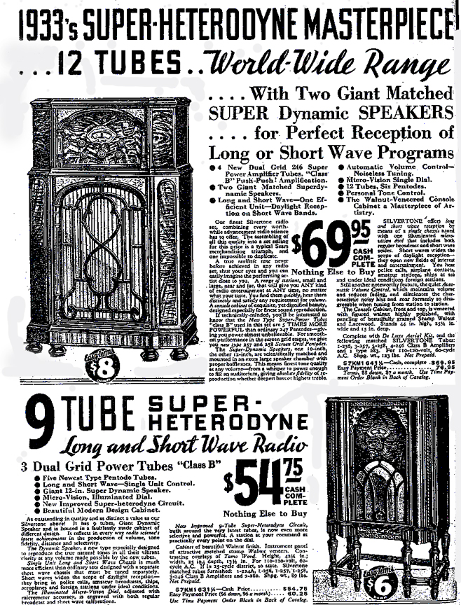 Silvertone M-1535 Radio $51 in 1931 is equivalent to $1,300 in 2009 dollars BUT -- that's without the tubes! Add another $22 ($600) if you want it to play Click to Enlarge The M-1535 was sold during the period when tubes sold separately. The full cost of the M1535 is $73, almost 50% more than the "base" price. Click here to look at another type of collectible. Sears Silvertone M-1670 Console Radio [ca 1933]The Model 1670 represents a great advance -- domestic (long wave) and international (short wave) reception is offered in a single unit. In order to tune both bands, the manufactureres (Colonial Radio) came up with something they called a "Micro Vision" dial. That meant that it worked like a Micrometer, not that it would enable you to see small things.