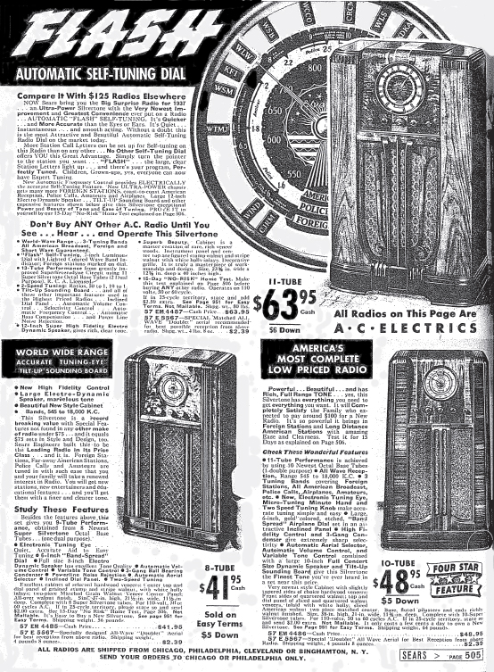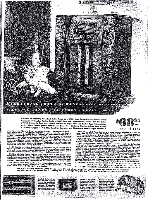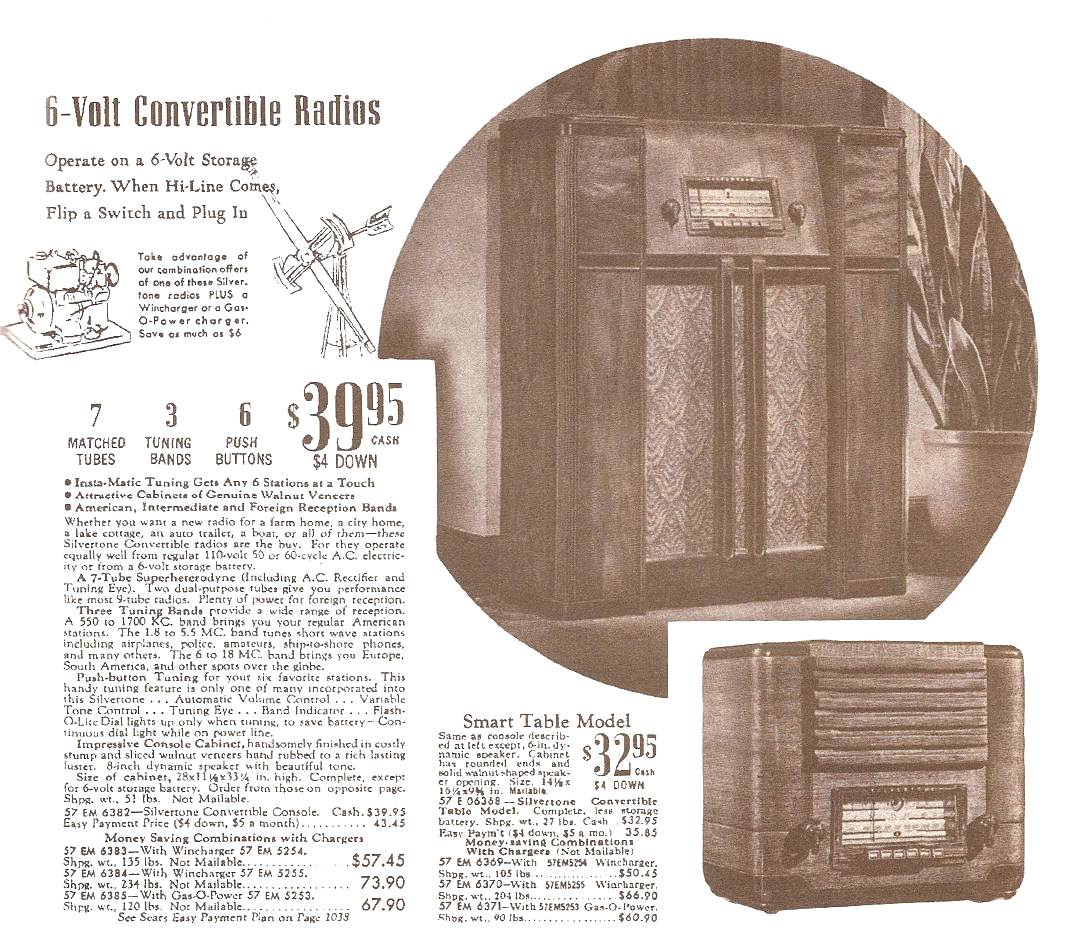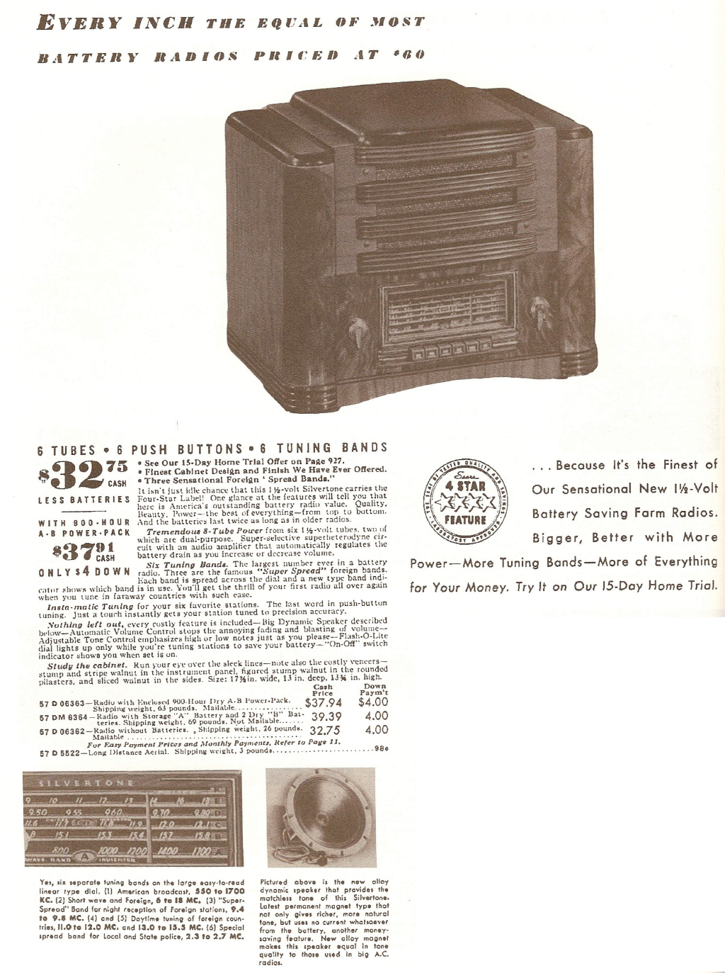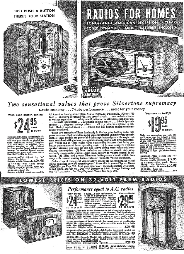 General Marshall's Philco Table Radio After retirement, he probably listened to baseball games on it.. Click to Enlarge The radio shown on top of a file cabinet is a Philco Model 48-1256. It was made in 1948 and is a good, sturdy useful radio with no unusual features. General Marshall also had a 1947 model TV set that is on our Vintage Television Page. The kitchen at Dodona Manor is full of marvelous artifacts from the 1940s and 1950s that are discussed on our Retro Kitchen Page. Click here to look at another type of collectible. The Business of Selling RadiosIn the decade 1929-1939, Radio was a BIG Business. At that time, there was no Bigger Business than Sears Roebuck. We have been fortunate to get hold of Sears mail-order catalogues from that decade, and we hereby present the radio advertising pages for your enjoyment. Be warned, however, that there will be some math later on as we take a look at that the penetration of technology into Mass Markets. You will have some deja vu moments if you got stuck paying $1,000 for one of those cellular_phone-in-a-bag things (or the $700 i-phone...)