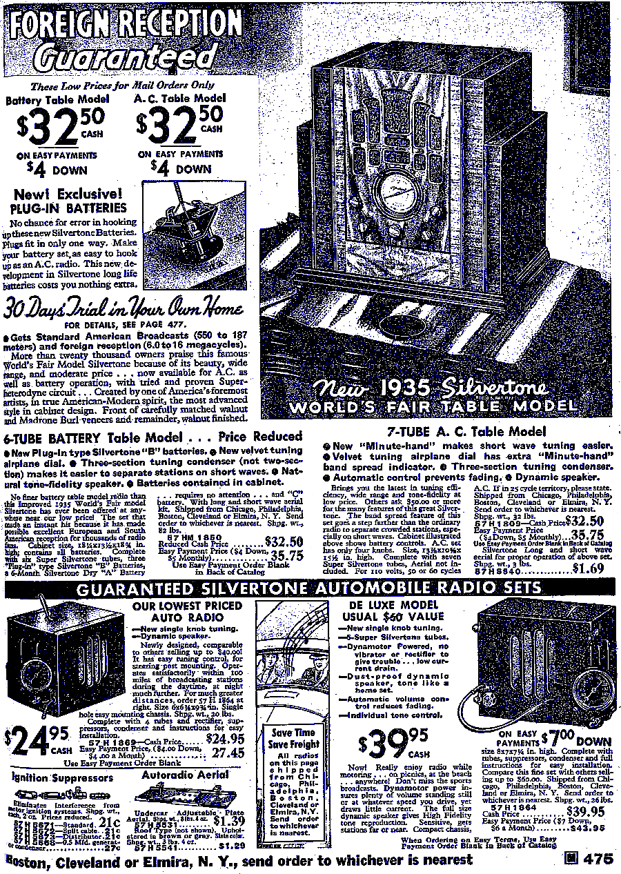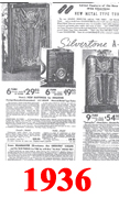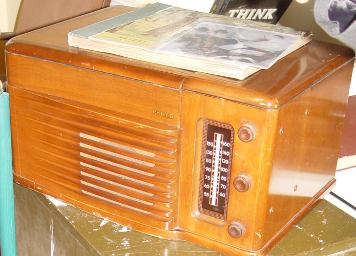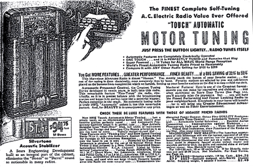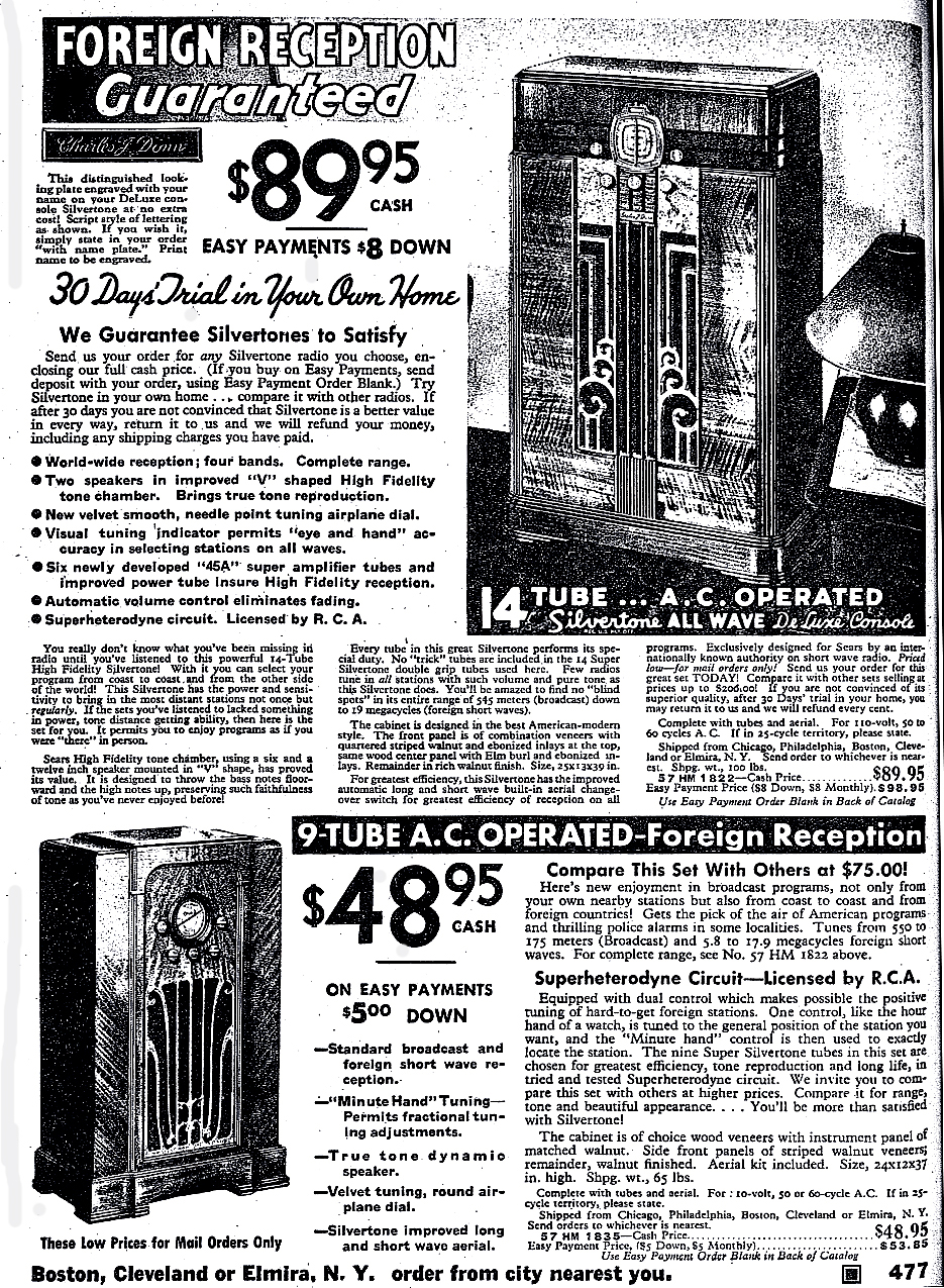General Marshall's Philco Table Radio After retirement, he probably listened to baseball games on it.. Click to Enlarge The radio shown on top of a file cabinet is a Philco Model 48-1256. It was made in 1948 and is a good, sturdy useful radio with no unusual features. General Marshall also had a 1947 model TV set that is on our Vintage Television Page. The kitchen at Dodona Manor is full of marvelous artifacts from the 1940s and 1950s that are discussed on our Retro Kitchen Page. Click here to look at another type of collectible. The Business of Selling RadiosIn the decade 1929-1939, Radio was a BIG Business. At that time, there was no Bigger Business than Sears Roebuck. We have been fortunate to get hold of Sears mail-order catalogues from that decade, and we hereby present the radio advertising pages for your enjoyment. Be warned, however, that there will be some math later on as we take a look at that the penetration of technology into Mass Markets. You will have some deja vu moments if you got stuck paying $1,000 for one of those cellular_phone-in-a-bag things (or the $700 i-phone...)