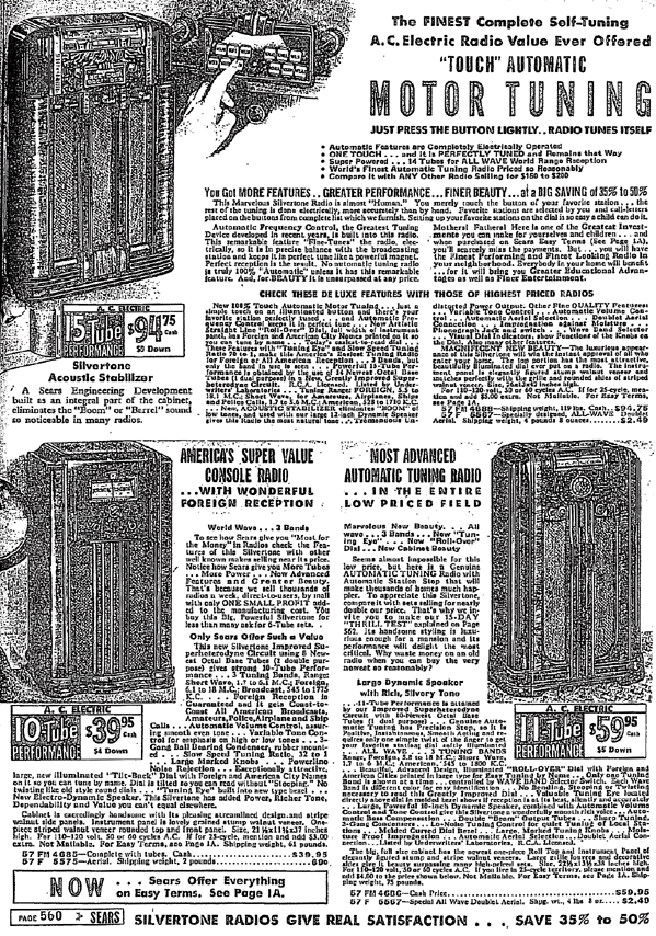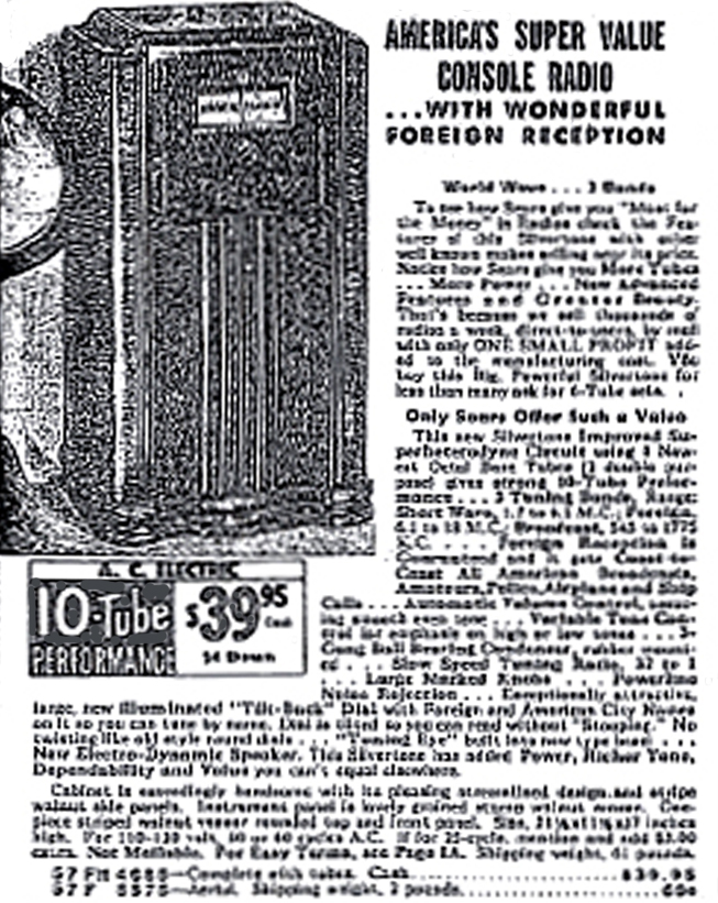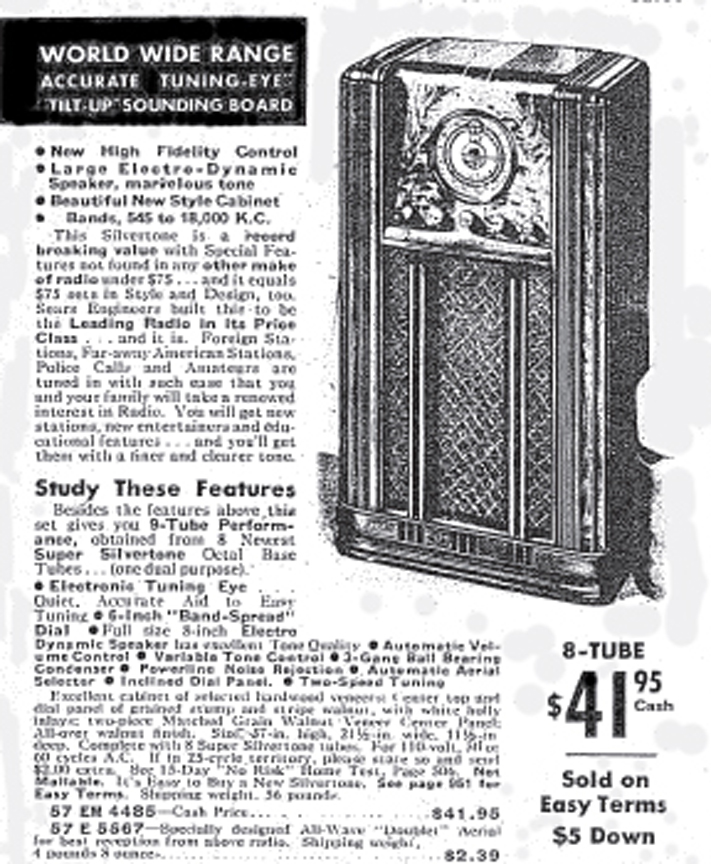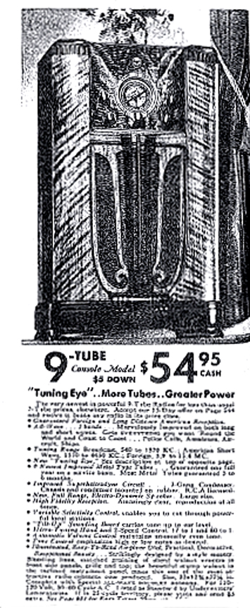 The Sears Model 1938 Table Radio $19.95 in 1935 is equivalent to $600 in 2009 dollars Click to Enlarge The Model 1938 table radio was a 6 tube superheterodyne set that tuned tha American Broadcast Band (540-1600KC, the American Short Wave band (1580-5100 KC, and Foreign Short Wave 5.8-15.5 MC. The ad says "At these prices, there's no need for you and your family to MISS the BIG THRILLS of Radio." In 1936, many folks worked for a lot less than $20 a week. This set had a lot of features that were nominally comparable to much more expensive brands like Philco or Zenith. Generally, Sears did not innovate. They introduced features a year or two after the high end brands. This is a nice table radio, but it is not particularly elegant. Click here to look at another type of collectible. The Sears Model M-1968 Console Radio [ca 1936]The Model 1968 is of some note because it includes the "Magic Eye" tuner (discussed above). The Model 1968 came out in the 1936 catalogue year, less than two years after the "Tuning Eye" was introduced in high-end models. This was more-or-less the general pattern of dissemination of technological innovation to mass distribution.