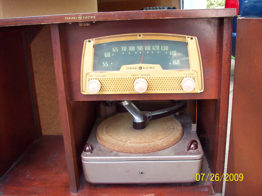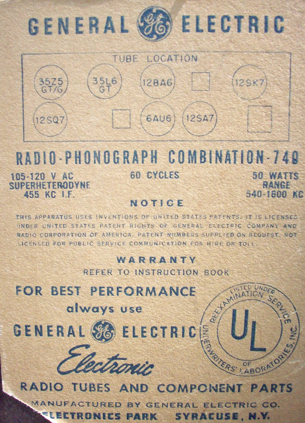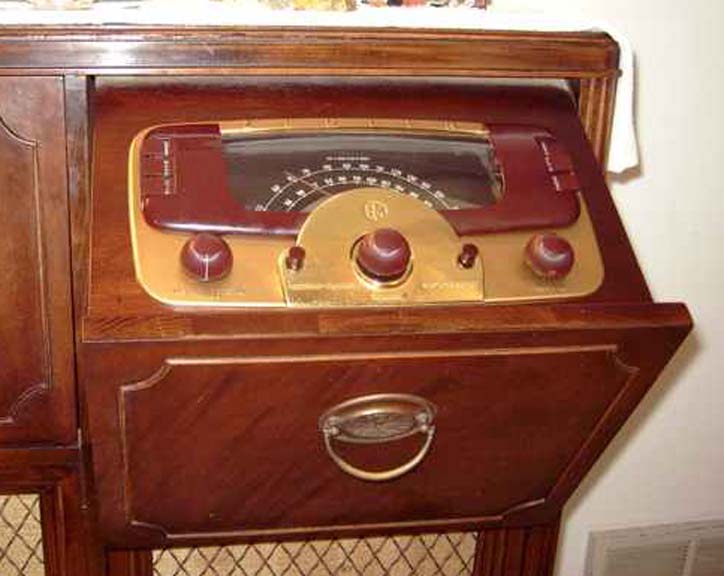 Posted July 29, 2009 General Electric Postwar Radio-Phono Consoles The General Electric company made very few console radios and even fewer with the dial and changer hidden inside a cabinet. During the postwar period, GE focused efforts on small plastic table radios, possibly because they were aware that Television was the wave of the future and that the big mahogany thing in the Living Room would be more likely a TV and not a console radio. Here are two examples of GE's last entries in the big ticket living room radio market. First up is the Model 749. These photos were sent by our reader Grant in Wisconsin. The radio looks like it is in beautiful condition. It is a seven tube radio-phono combination, most likely made in 1949