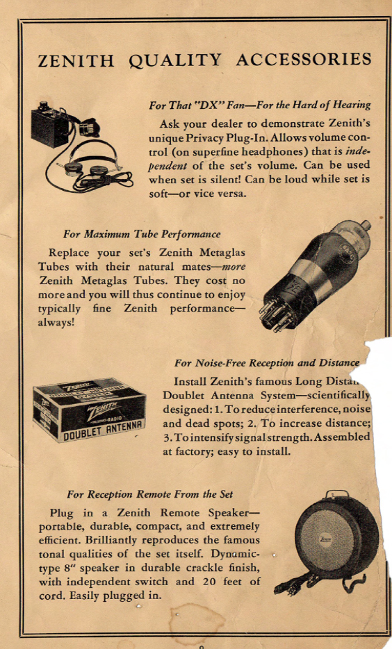 Using the Magic Eye Tuner Click here to learn more about the Magic Eye Click to Enlarge You may download the manual for the 12S267 here: ![]() Download the Manual for the 12S267 Nothing has really changed in 70 years. Here we find that Zenith has begun to offer the forerunners of "Parental Controls" and the "TV Ears". Things To Come Parental Controls and "TV Ears" Click to Enlarge Click here to look at another type of collectible, or keep on scrolling for more Radios. | |||||||