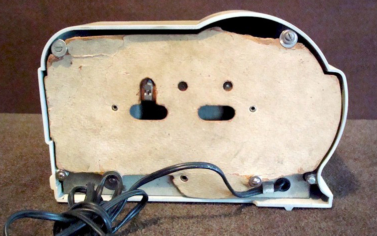 Posted May 13, 2005 Kim's 1964 GE Model 201 These little table radios were very popular and desirable in their day -- GE and Philco had some of the best designers in the country working on them. This photo was sent in to us by our reader Kim in Colorado. This one is special because it is not assymetric. If you look, most of the table radios radios between 1935 and 1955 have the speaker off to one side. The reason was that the old-style wooden "symmetric" radios, called "tombstones" (that's what they looked like) didn't perform all that well. The new circuits and smaller tubes that allowed plastic radios to be feasible -- and they generally split the cabinet volume with the right half components and the left half holding the biggest speaker possible (to get the amount of sound power that people wanted). Separating the speaker from the tubes was necessary because the heat from the tubes could melt the glue that held the speaker cone on (or set it on fire...) A radio with a big speaker looking at you from the left was considered to be "powerful" -- you could take it outside and listen to the ball game while you were washing your car. [My Dad did that...] This was a big factor in making an expensive purchase. These sets were about $30 in the 1940s when people raised a family of 4 on $2,000/yr income. That $30 in 1946 would be about $600 today, so this little gadget is akin to a plasma screen TV today -- it would have been a nice luxury for a working class family. There was an old adage in the radio business that you couldn't sell a radio with the speaker on the right side. This little GE 201 was one of the first to break out of that mold. However, it wasn't until the mid 50s that Zenith was able to do a large business with a symmetric design in the H725 (see below). Click Here for a picture of another collector's Model 201 Here are some photos of the back of the set. If you can't read the picture, the tube lineup is: 12S67 125A7 12SQ7 35L6 GT/G 35Z5 GT/G