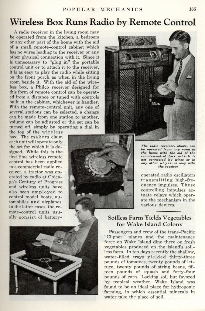 ![]() The Media and the Mystery Control Read about it in the August 1938 issue of Popular Mechanics Click to Enlarge The Philco "mystery control" has a small comic relief role in the film Topper Takes a Trip. Poor Cosmo Topper is drunk again with his ghostly friend Marion Kerby, this time in an upscale deco-themed bar. Topper tries to use the telephone but instead dials a radio station, mistaking the mystery control for the telephone dial. The bartender explains how the wireless control works, because most of the folks in the audience had never seen one. The whole scene takes about 10 minutes, so this was quite a product placement coup for Philco. ![]() Lobby Card for the Film Topper Takes a Trip Click to Enlarge This was a very expensive set. The presets had to be installed by a factory technician and it took a considerable amount of "fiddling" to get the thing to work properly. In New York, rich people in the same swank apartment buildings would be annoyed when someone else's "mystery control" changed their station, as the range of the control was not limited to any one apartment. Also, the RF signal given off by faulty auto distributors could also change the channel. In addition, "Mystery Controls" were available for other appliances. We like this approach to the "smart house" circa 1939 using thechnology very similar to the RCA controller. ![]() 1939 "Smart House" Radio Control Note the ad for the Toast-O-Lator, one of our favorite appliances Click to Enlarge In the 1960s, Zenith tried to solve this annoying interference problem with a wireless remote that used sound instead of RF. The Zenith remote (the "Space Command") used tuned "reeds" to produce a sound that was theoretically undetectable by humans. The receiver had similar reeds tuned to the frequency. The device controlled on/off and volume. Alas, it was found that pets could certainly hear the reeds and that parrots could learn to imitate the sound. Other remotes using light pulses (problems during daytime) were also tried without success. The remote came into its own when infrared technology was developed. HOWEVER, these were only developments in the type of signal to be used -- the basic circuits and controls within the receiver (i.e. the mechanism to step the tuner or turn the set off) remained largely unchanged in theory from the Model 39-116.