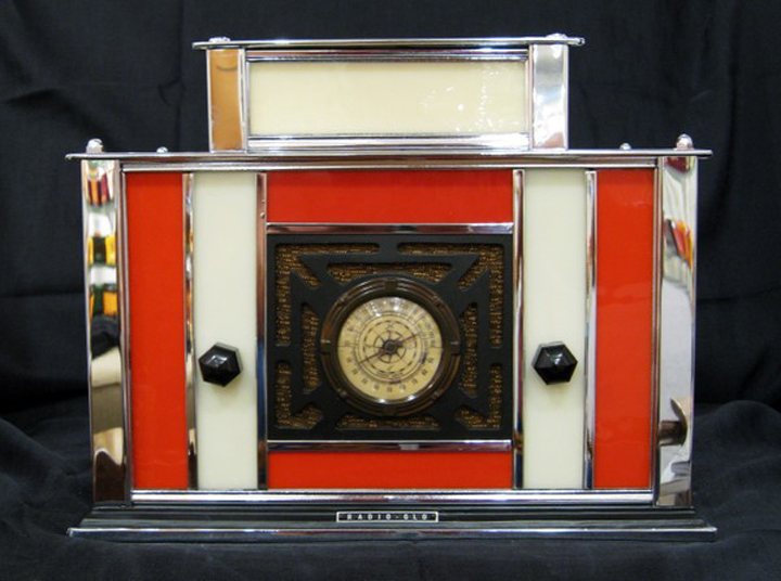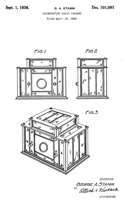 Radio-Glo Design Patent D - 101,091 Click to Enlarge Click here if you want to learn how to get Free Patent Drawings the cabinet was made of red and white (sometimes black and white) stained glass panels that light up with chromed metal vertical spacers and pilasters Click here to look at another type of collectible, or keep on scrolling for more Radios. | |||||||