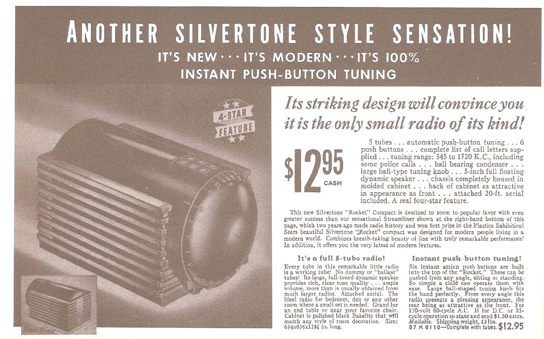 Posted June 3, 2009 1938 Silvertone Model 6110 Table Radio The Silvertone model 6110, better known as the "Rocket", is a particularly striking example of 1930's machine-age design. Introduced by Sears in 1938, it was claimed to be "designed for modern people living in a modern world". It appeared in their 1938 catalog with an initial selling price of $12.95. It was widely advertised in the media and could be purchased in Sears' stores for just a few dollars more than through their catalog. It continued to be marketed until late 1939, by which time Sears was claiming that it was a "sensational best seller". 1938 Sears Catalogue ad for he Silvertone Model 6110 Table Radio Click to Enlarge In spite of this claim, the set is rare today, possibly because of its highly fragile housing. As a result the purchase price in today's collectibles marketplace has "rocketed" to more than one hundred times what it could be bought for when new! The cabinet design was by Clarence Karstadt (US design patent D- 113,004). It was available in black bakelite (as here), "mottled walnut" brown bakelite and ivory plaskon. Although the "rocket" was initially offered for sale in 1938 without mention of the World's Fair, by 1939 it was billed by Sears as being "designed to reflect the architectural splendor of 1939's great World's Fair"!.