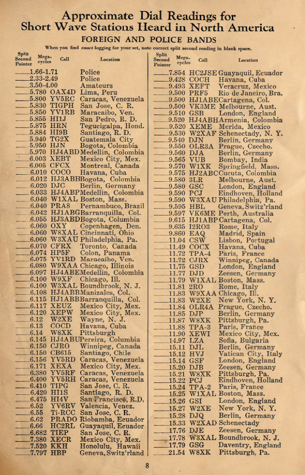 Here is a list of the short wave sataions that could be received in 1938: ![]() List of Short Wave Stations in 1938 Click to Enlarge Click here to look at another type of collectible, or keep on scrolling for more Radios. | |||||||