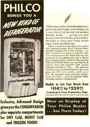 ![]() Philco 42-KR5 Radio ![]() Philco 42-KR3 ![]() The Refrigerator that these guys sat on ![]() The Combination ![]() Phico Refrigerator Ad from LIFE Magazine 10-06-1941 $114.75 in 1941 is the same as $2,409.75 in 2005 $259.95 in 1941 is the same as $5,458.95 in 2005 This was the "Zero King" of the 1940s! | |||||||