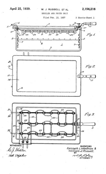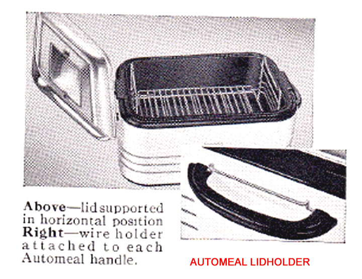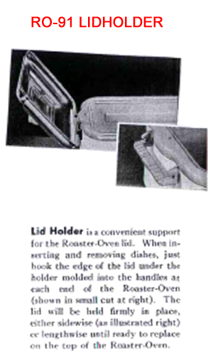 Evolution of the Lid Holder (Part 2) Click to Enlarge Basically, the earliest model (the "Jubilee") did not have a lid holder. If you have used a roaster, there is always a problem of where to put the lid while you are basting -- there is a good deal of condensation and it will create a puddle if you set it down right side up. If you can manage to put it upside down on a table without burning yourself, the lid is unstable. Thus, the engineers of Westinghouse came to the rescue with the "Lid Holder". In the Automeal, theis took the form of a wire bail. In the RO-29, the lid holders are metal pieces, separate from the handles. Following this, from the RRA-94 through the RO-91, the handle plus two lid holders were molded into one piece. The RO-541 series went back to the metal pices, reverting to the RO-29 design. Roasting the TurkeyAt thanksgiving time, many of you may be wondering if you can cook a turkey in the Westinghous Roaster. The answer is DEFINITELY YES! ![]() Roasting the Turkey From the Westinghouse Roaster Manual In Case, you can't read this, here is the text: Clean and stuff turkey using favorite dressing recipe. Place turkey on rack in large inset pan. If an especially large turkey is to be roasted, it may be placed in the well of the roaster-oven on a flat shallow pan and the inset pan inverted over the well to form the cover. The small pin on either side of the well will hold the inset pan in place. To clean well after roasting, wipe with a damp cloth. Do not immerse oven-roaster in Water. Oven Weight = weight of a stuffed, dressed turkey (weight, temperature, cooking time) Oven weight 8-10 LB, temp 325 , 3.0-3.5 hours Oven weight 10-14 LB, temp 325 , 3.5 -4.0 hours Oven weight 14-18 LB, temp 300 , 4.0-4.5 hours This marvelous gadget was designed in 1938 and changed very little. Knockoffs of this appliance (made in China, of course) are still being sold today in a form almost unchanged from 1938. From the beginning, Westinghouse envisioned a Roaster with a Griddle and Rotisserie attachment, as shown below.